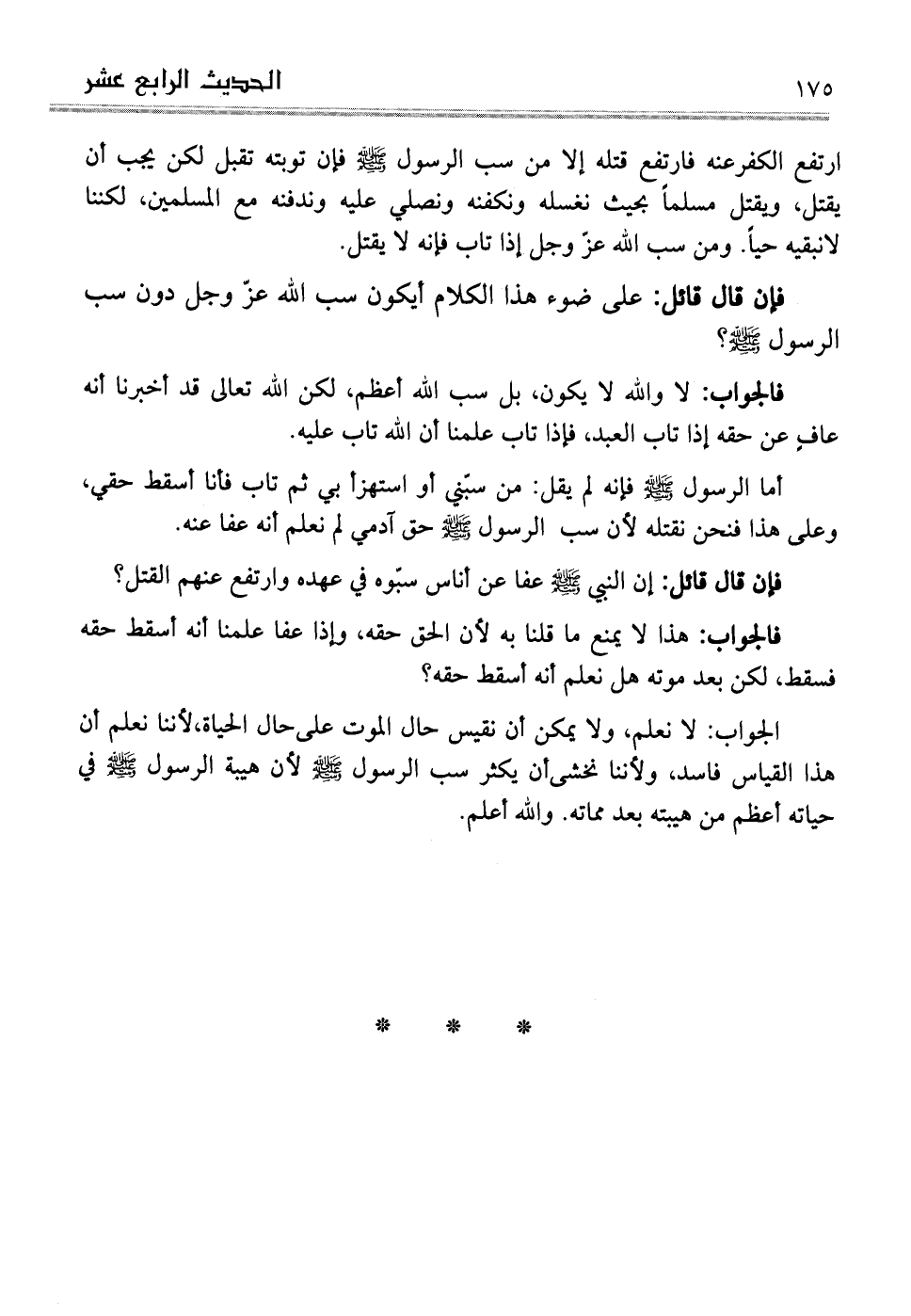 الجواب: لا نعلم، ولا يمكن أن نقيس حال الموت علىحال الحياة، لأننا نعلم أن هذا القياس فاسد، ولأننا نخشىأن يكثر سب الرسول صلى الله عليه وسلم لأن هيبة الرسول صلى الله عليه وسلم في حياته أعظم من هيبته بعد مماته. والله أعلم.