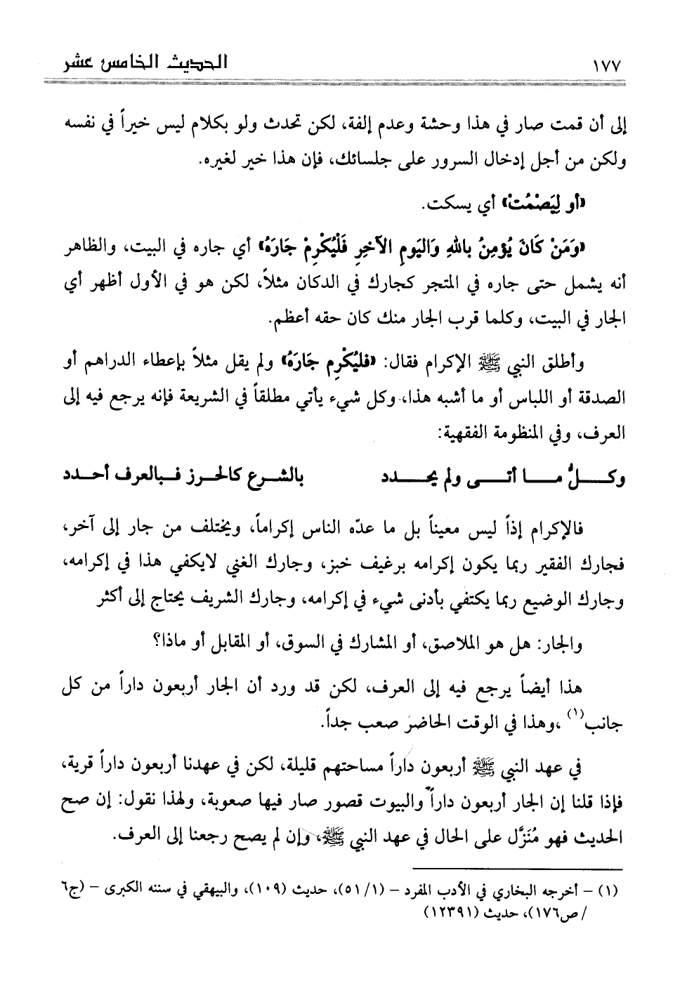وأطلق النبي صلى الله عليه وسلم الإكرام فقال: "فليُكْرِم جَارَهُ" ولم يقل مثلاً بإعطاء الدراهم أو الصدقة أو اللباس أو ما أشبه هذا، وكل شيء يأتي مطلقاً في الشريعة فإنه يرجع فيه إلى العرف، وفي المنظومة الفقهية: