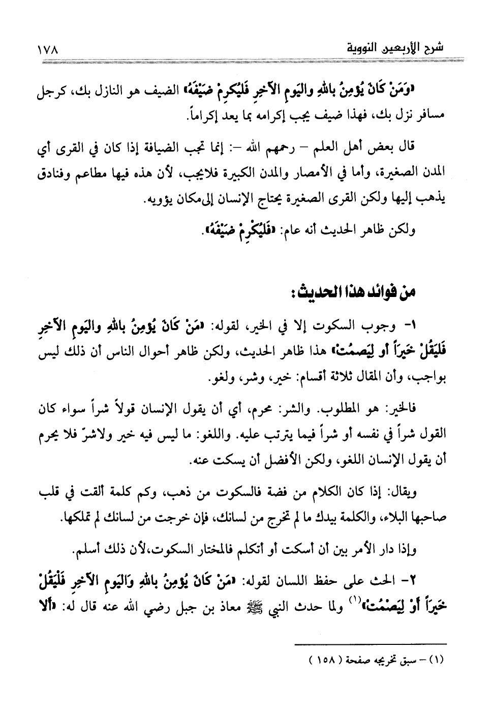 . 1 وجوب السكوت إلا في الخير، لقوله: "مَنْ كَانَ يُؤمِنُ باللهِ واليَومِ الآخِرِ فَليَقُلْ خَيرَاً أو لِيَصمُتْ" هذا ظاهر الحديث، ولكن ظاهر أحوال الناس أن ذلك ليس بواجب، وأن المقال ثلاثة أقسام: خير، وشر، ولغو.