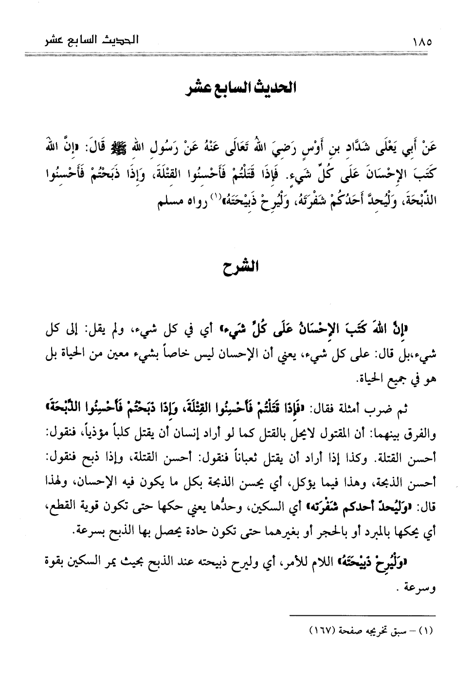 عَنْ أَبِي يَعْلَى شَدَّادِ بنِ أَوْسٍ رَضِيَ اللهُ تَعَالَى عَنْهُ عَنْ رَسُولِ اللهِ صلى الله عليه وسلم قَالَ: (إِنَّ اللهَ كَتَبَ الإِحْسَانَ عَلَى كُلِّ شَيءٍ. فَإِذَا قَتَلْتُمْ فَأَحْسِنُوا القِتْلَةَ، وَإِذَا ذَبَحْتُمْ فَأَحْسِنُوا الذِّبْحَةَ، وَلْيُحِدَّ أَحَدُكُمْ شَفْرَتَهُ، وَلْيُرِحْ ذَبِيْحَتَهُ) (¬1) رواه مسلم