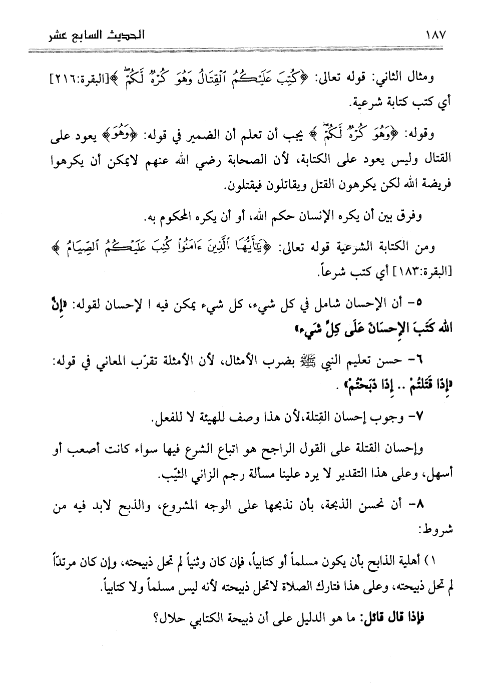 . 5أن الإحسان شامل في كل شيء، كل شيء يمكن فيه الإحسان لقوله: إِنَّ الله كَتَبَ الإِحسَانَ عَلَى كِلِّ شَيء