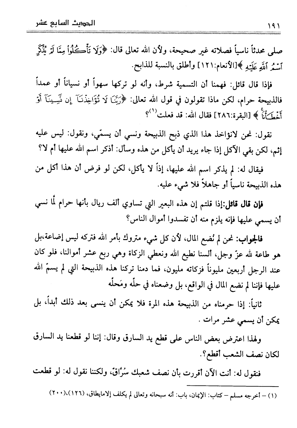 ثانياً: إذا حرمناه من الذبيحة هذه المرة فلا يمكن أن ينسى بعد ذلك أبداً، بل يمكن أن يسمي عشر مرات.