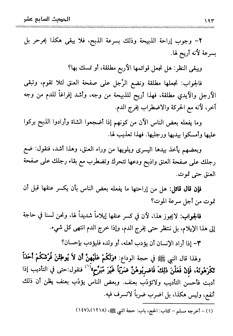 2وجوب إراحة الذبيحة وذلك بسرعة الذبح، فلا يبقى هكذا يحرحر بل بسرعة لأنه أريح لها.