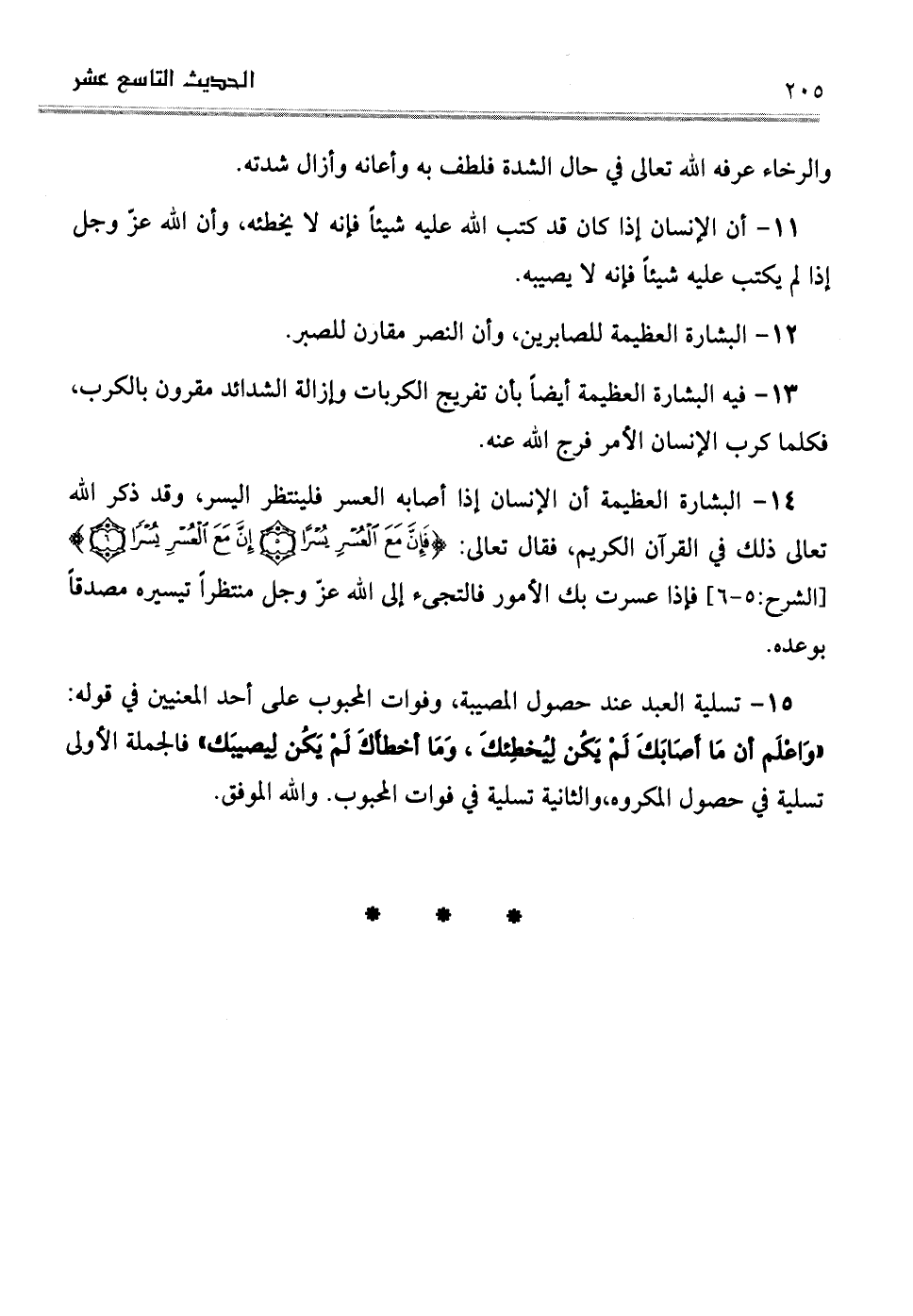 . 15تسلية العبد عند حصول المصيبة، وفوات المحبوب على أحد المعنيين في قوله: "وَاعْلَم أن مَا أَصَابَكَ لَمْ يَكُن لِيُخطِئكَ، وَمَا أخطأَكَ لَمْ يَكُن لِيصيبَك" فالجملة الأولى تسلية في حصول المكروه، والثانية تسلية في فوات المحبوب. والله الموفق.
