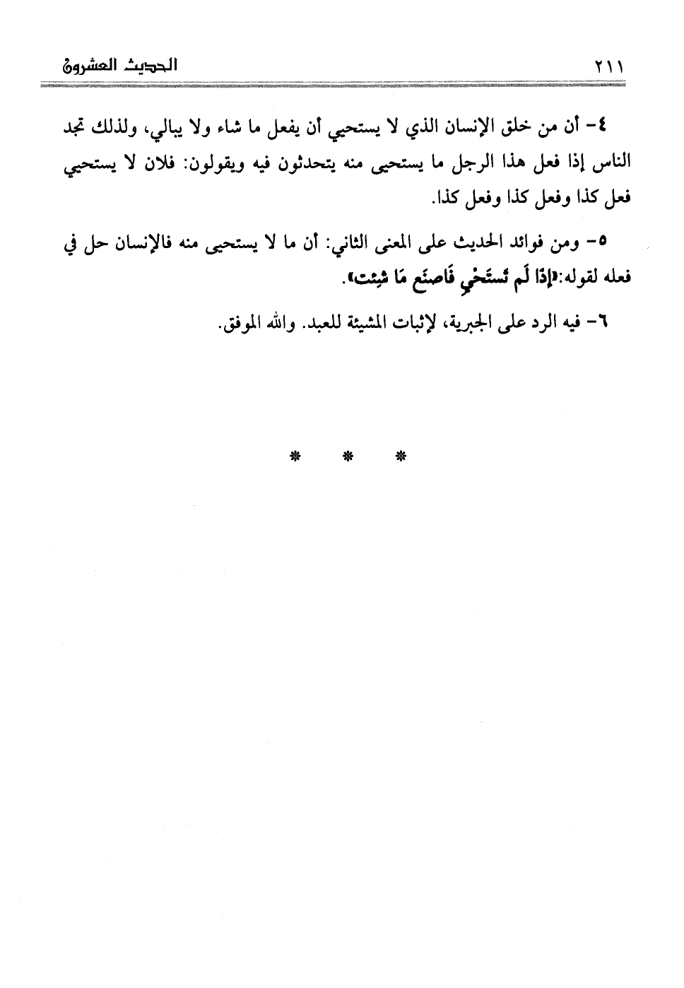 5- ومن فوائد الحديث على المعنى الثاني: أن ما لا يستحيى منه فالإنسان حل في فعله لقوله: إذَا لَم تَستَحْيِ فَاصنَع مَا شِئت.