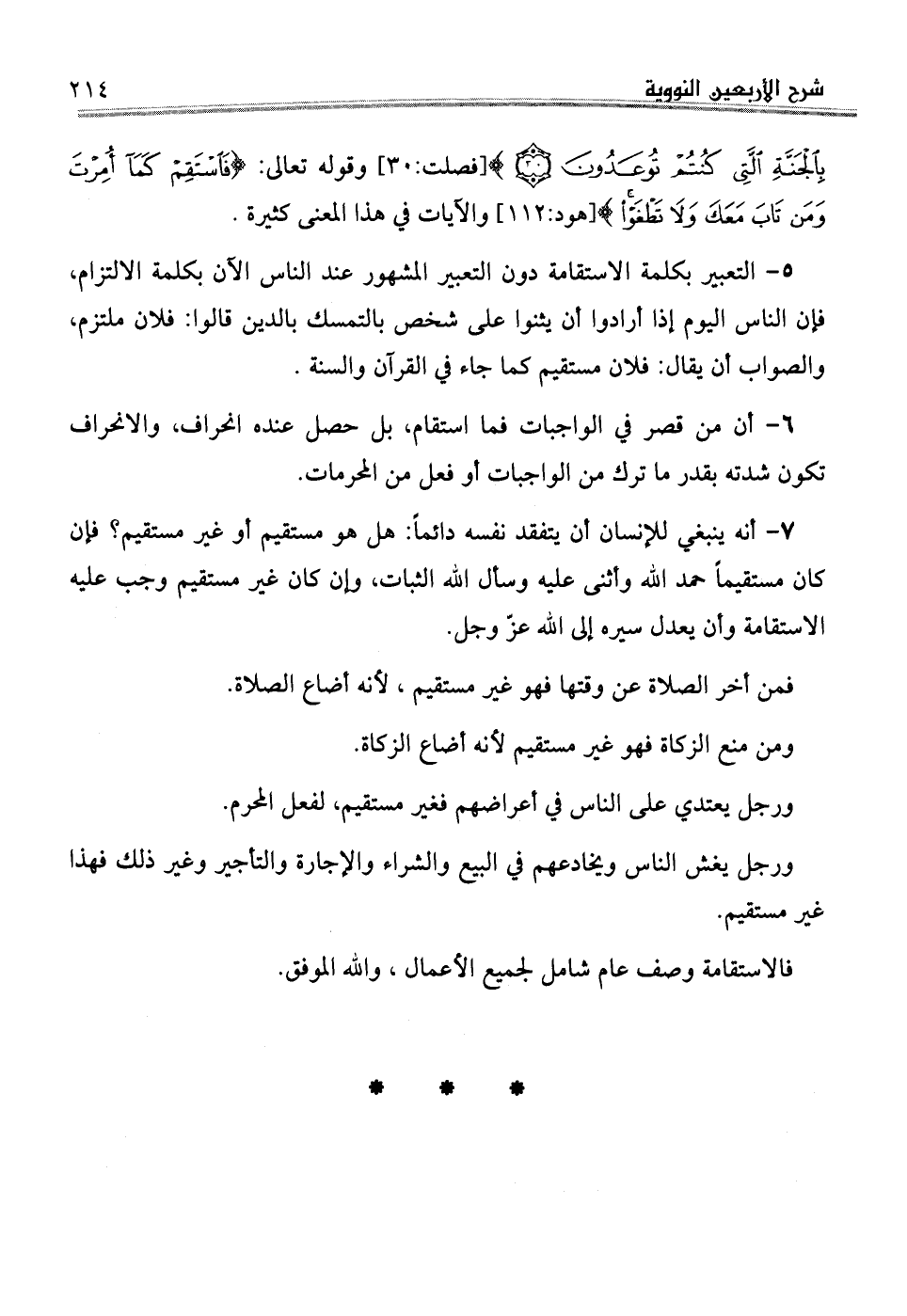 7أنه ينبغي للإنسان أن يتفقد نفسه دائماً: هل هو مستقيم أو غير مستقيم؟ فإن كان مستقيماً حمد الله وأثنى عليه وسأل الله الثبات، وإن كان غير مستقيم وجب عليه الاستقامة وأن يعدل سيره إلى الله عزّ وجل.