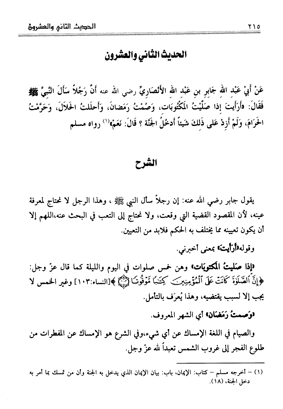 عَنْ أَبيْ عَبْدِ اللهِ جَابِرِ بنِ عَبْدِ اللهِ الأَنْصَارِيِّ رضي الله عنه أَنَّ رَجُلاً سَأَلَ النبي صلى الله عليه وسلم فَقَالَ: "أَرَأَيتَ إِذا صَلَّيْتُ المَكْتُوبَاتِ، وَصُمْتُ رَمَضانَ، وَأَحلَلتُ الحَلاَلَ، وَحَرَّمْتُ الحَرَامَ، وَلَمْ أَزِدْ عَلى ذَلِكَ شَيئاً أَدخُلُ الجَنَّة؟ قَالَ: نَعَمْ" (¬1) رواه مسلم