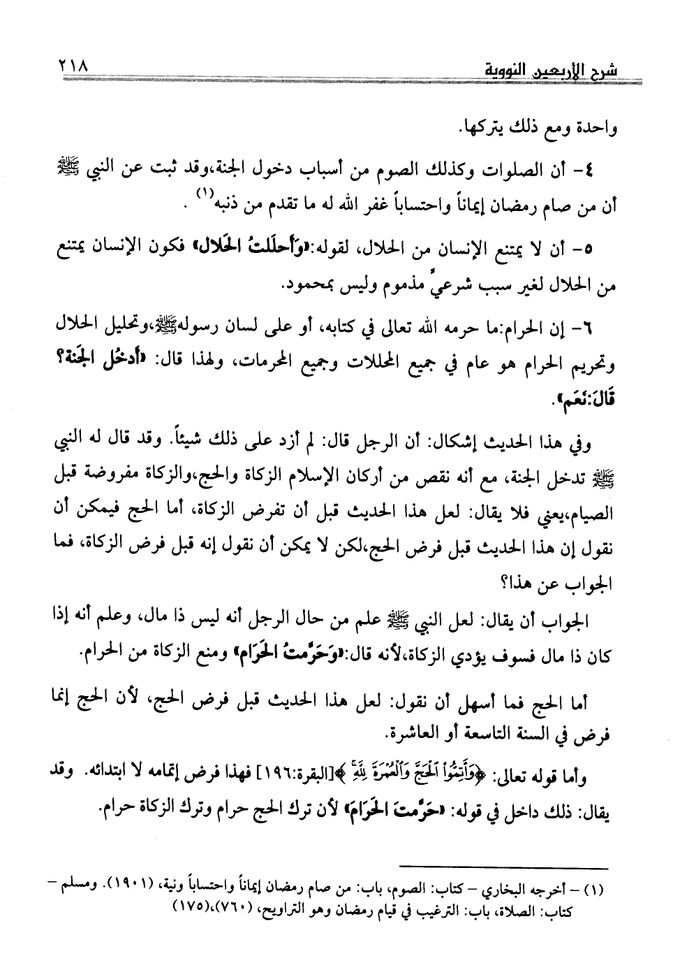 . 6إن الحرام: ما حرمه الله تعالى في كتابه، أو على لسان رسوله صلى الله عليه وسلم، وتحليل الحلال وتحريم الحرام هو عام في جميع المحللات وجميع المحرمات، ولهذا قال: أَدخُل الجَنة؟ قَالَ: نَعَم.
