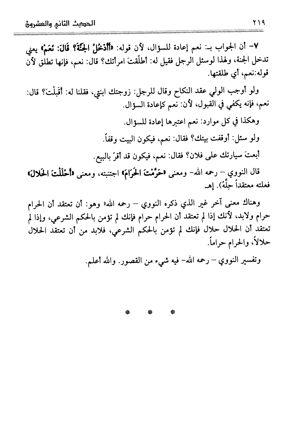 7أن الجواب بـ: نعم إعادة للسؤال، لأن قوله: أَأَدْخُلُ الجَنَّةَ؟ قَالَ: نَعَمْ يعني تدخل الجنة، ولهذا لوسئل الرجل فقيل له: أطلّقتَ امرأتك؟ قال: نعم، فإنها تطلق لأن قوله: نعم، أي طلقتها.