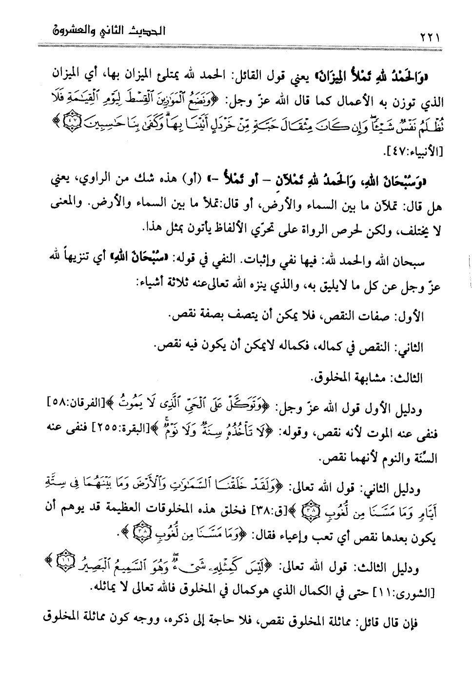 "سبحان الله والحمد لله": فيها نفي وإثبات. النفي في قوله: "سُبْحَانَ اللهِ" أي تنزيهاً لله عزّ وجل عن كل ما لايليق به، والذي ينزه الله تعالىعنه ثلاثة أشياء: