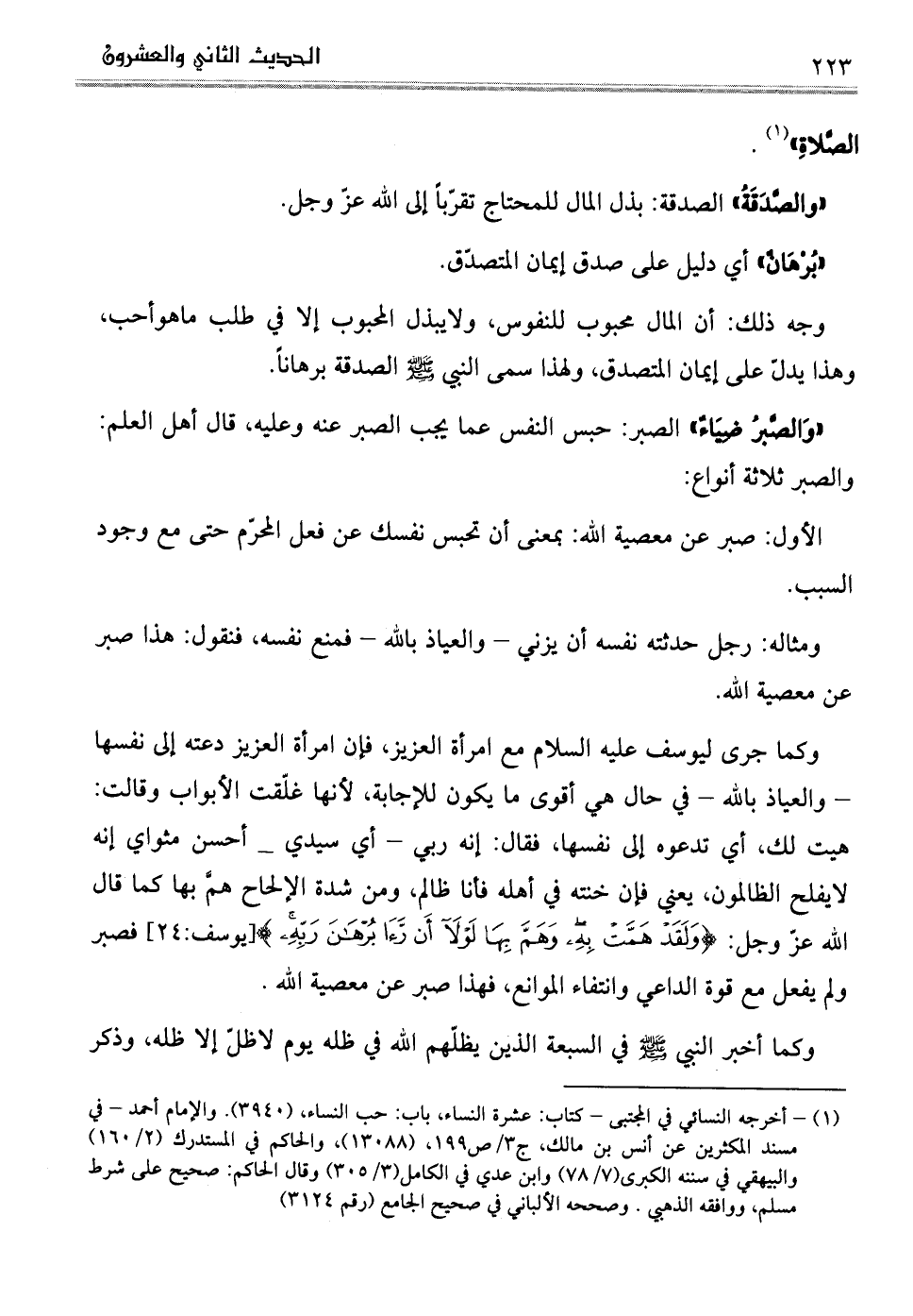 وَالصَّبرُ ضِيَاءٌ الصبر: حبس النفس عما يجب الصبر عنه وعليه، قال أهل العلم: والصبر ثلاثة أنواع: