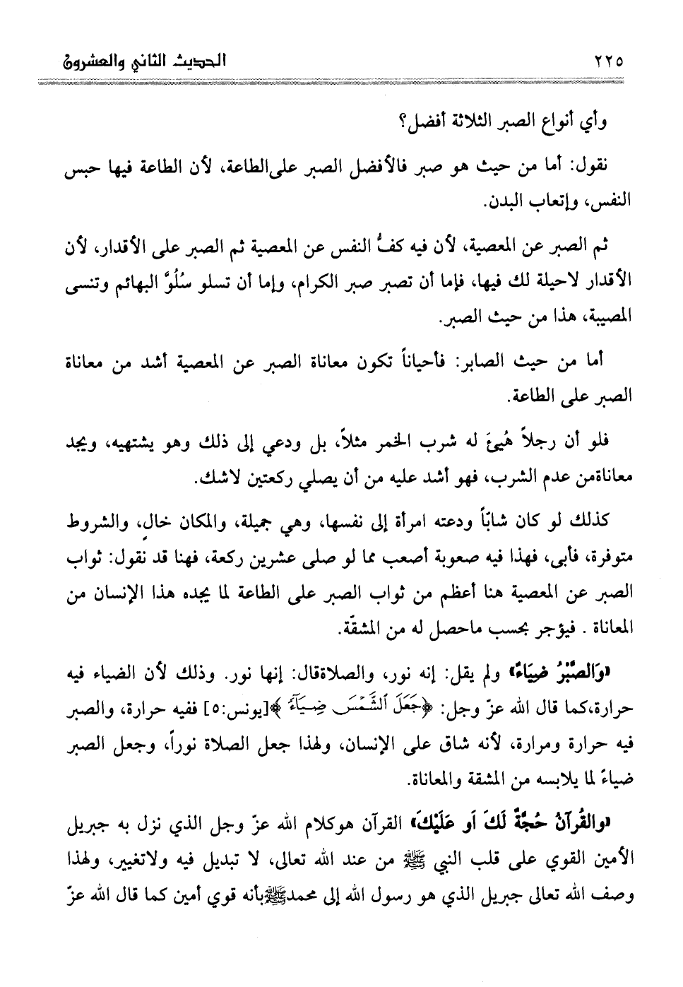 "وَالصَّبْرُ ضِيَاءٌ" ولم يقل: إنه نور، والصلاةقال: إنها نور. وذلك لأن الضياء فيه حرارة، كما قال الله عزّ وجل: (جَعَلَ الشَّمْسَ ضِيَاءً) (يونس: الآية5) ففيه حرارة، والصبر فيه حرارة ومرارة، لأنه شاق على الإنسان، ولهذا جعل الصلاة نوراً، وجعل الصبر ضياءً لما يلابسه من المشقة والمعاناة.