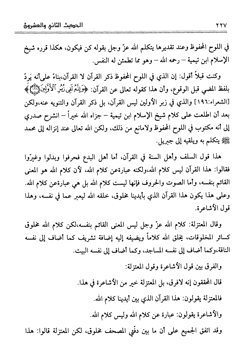 وكنت قبلاً أقول: إن الذي في اللوح المحفوظ ذكر القرآن لا القرآن، بناءً علىأنه يَرِدُ بلفظ المضي قبل الوقوع، وأن هذا كقوله تعالى عن القرآن: (وَإِنَّهُ لَفِي زُبُرِ الْأَوَّلِينَ) (الشعراء: 196) والذي في زبر الأولين ليس القرآن، بل ذكر القرآن والتنويه عنه، ولكن بعد أن اطلعت على كلام شيخ الإسلام ابن تيمية - جزاه الله خيراً - انشرح صدري إلى أنه مكتوب في اللوح المحفوظ ولامانع من ذلك، ولكن الله تعالى عند إنزاله إلى محمد صلى الله عليه وسلم يتكلم به ويلقيه إلى جبريل.