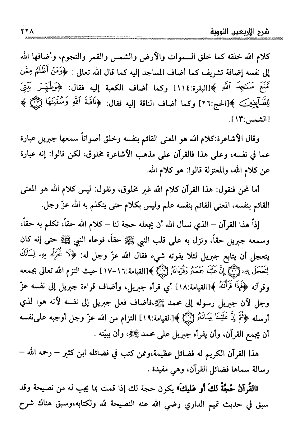 كلام الله خلقه كما خلق السموات والأرض والشمس والقمر والنجوم، وأضافها الله إلى نفسه إضافة تشريف كما أضاف المساجد إليه كما قال الله تعالى: (وَمَنْ أَظْلَمُ مِمَّنْ مَنَعَ مَسَاجِدَ اللَّهِ) (البقرة: الآية114) وكما أضاف الكعبة إليه فقال: (وَطَهِّرْ بَيْتِيَ لِلطَّائِفِينَ) (الحج: الآية26) وكما أضاف الناقة إليه فقال: (نَاقَةَ اللَّهِ وَسُقْيَاهَا) (الشمس: الآية13) وقال الأشاعرة: كلام الله هو المعنى القائم بنفسه وخلق أصواتاً سمعها جبريل عبارة عما في نفسه، وعلى هذا فالقرآن على مذهب الأشاعرة مخلوق، لكن قالوا: إنه عبارة عن كلام الله، والمعتزلة قالوا: هو كلام الله.