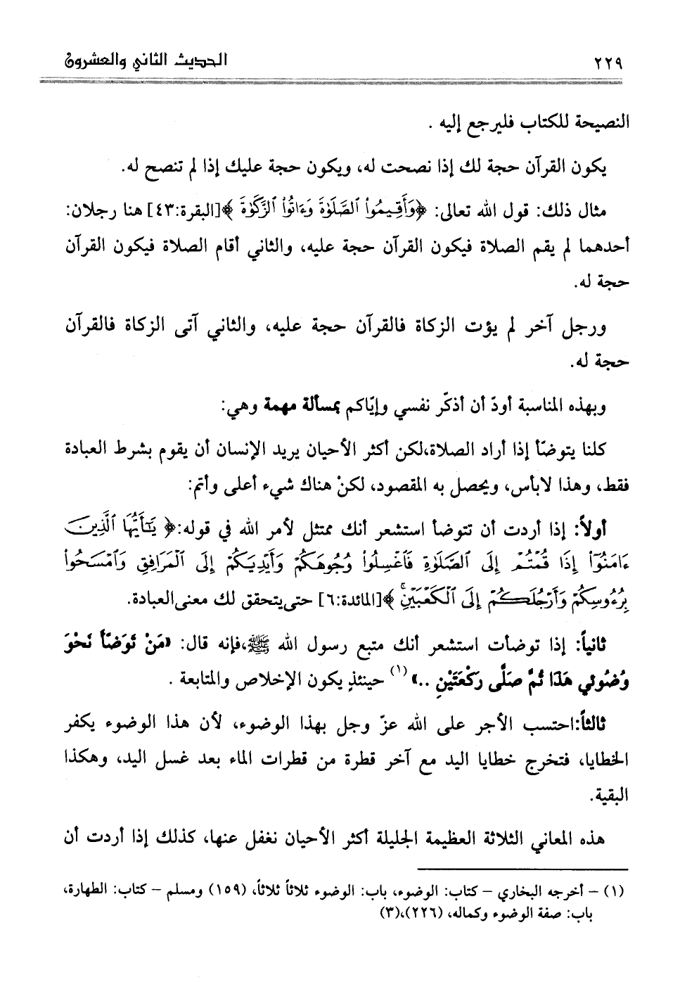 ثانياً: إذا توضأت استشعر أنك متبع رسول الله، فإنه قال: "مَنْ تَوَضّأَ نَحْوَ وُضُوئي هَذَا ثُمَّ صَلَّى رَكْعَتَيْنِ" (¬1) حينئذٍ يكون الإخلاص والمتابعة.