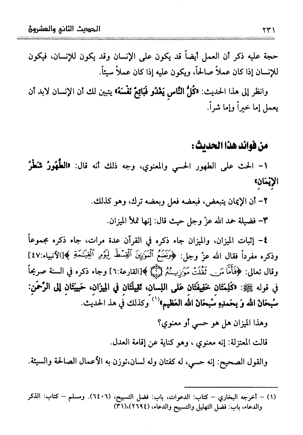 . 4إثبات الميزان، والميزان جاء ذكره في القرآن عدة مرات، جاء ذكره مجموعاً وذكره مفرداً فقال الله عزّ وجل: (وَنَضَعُ الْمَوَازِينَ الْقِسْطَ لِيَوْمِ الْقِيَامَةِ) (الأنبياء: 47) وقال تعالى: (فَأَمَّا مَنْ ثَقُلَتْ مَوَازِينُهُ) (القارعة: 6) وجاء ذكره في السنة صريحاً في قوله صلى الله عليه وسلم: "كَلِمَتَانِ خَفِيفَتَانِ عَلى اللِسانِ، ثَقِيلَتَانِ في المِيزَانِ، حَبيبَتَانِ إلى الرَّحمَنِ: سُبحَانَ الله وَبِحَمدِهِ سُبحَانَ الله العَظيم" (¬1) وكذلك في هذ الحديث.