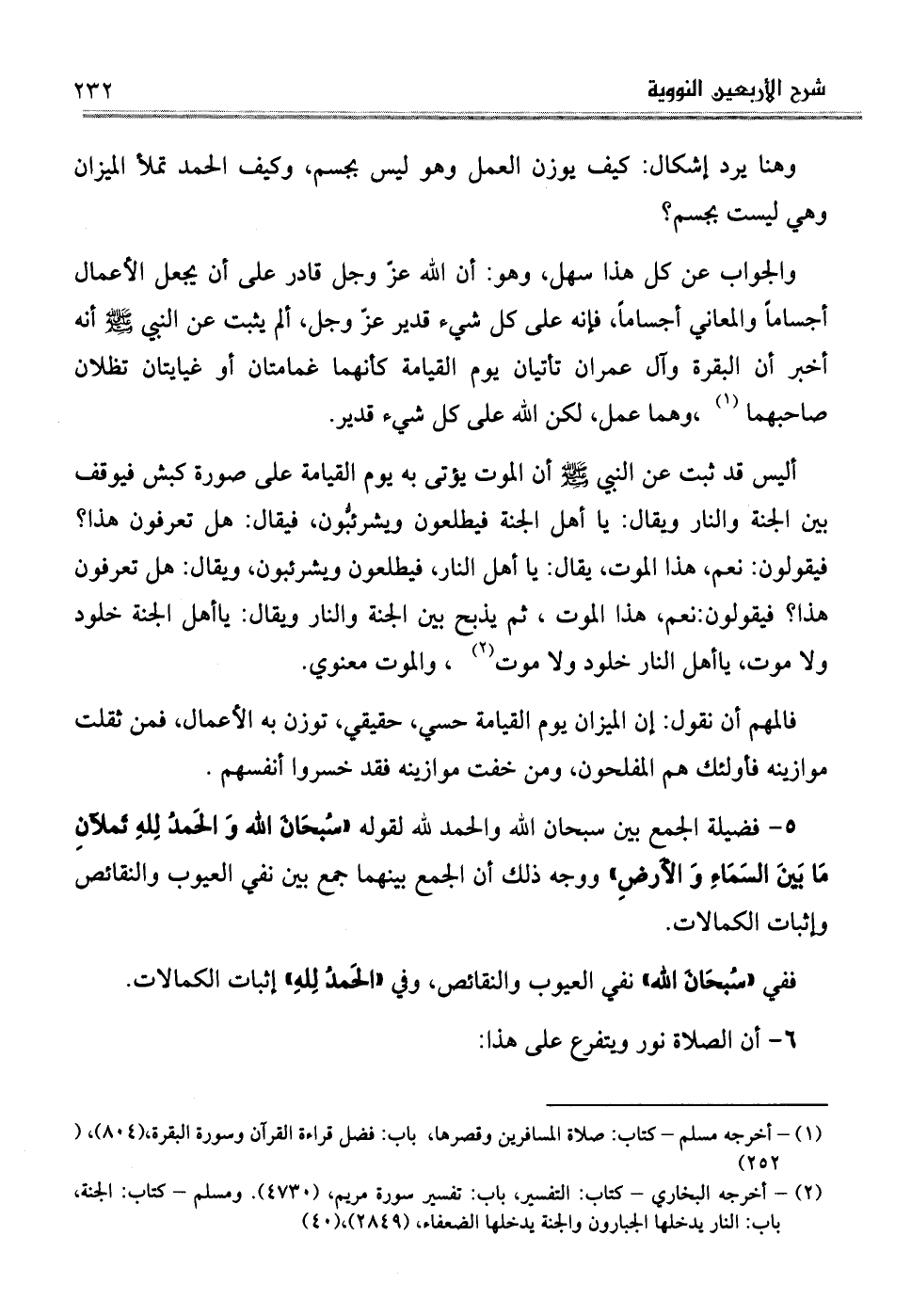 وهنا يرد إشكال: كيف يوزن العمل وهو ليس بجسم، وكيف الحمد تملأ الميزان وهي ليست بجسم؟
