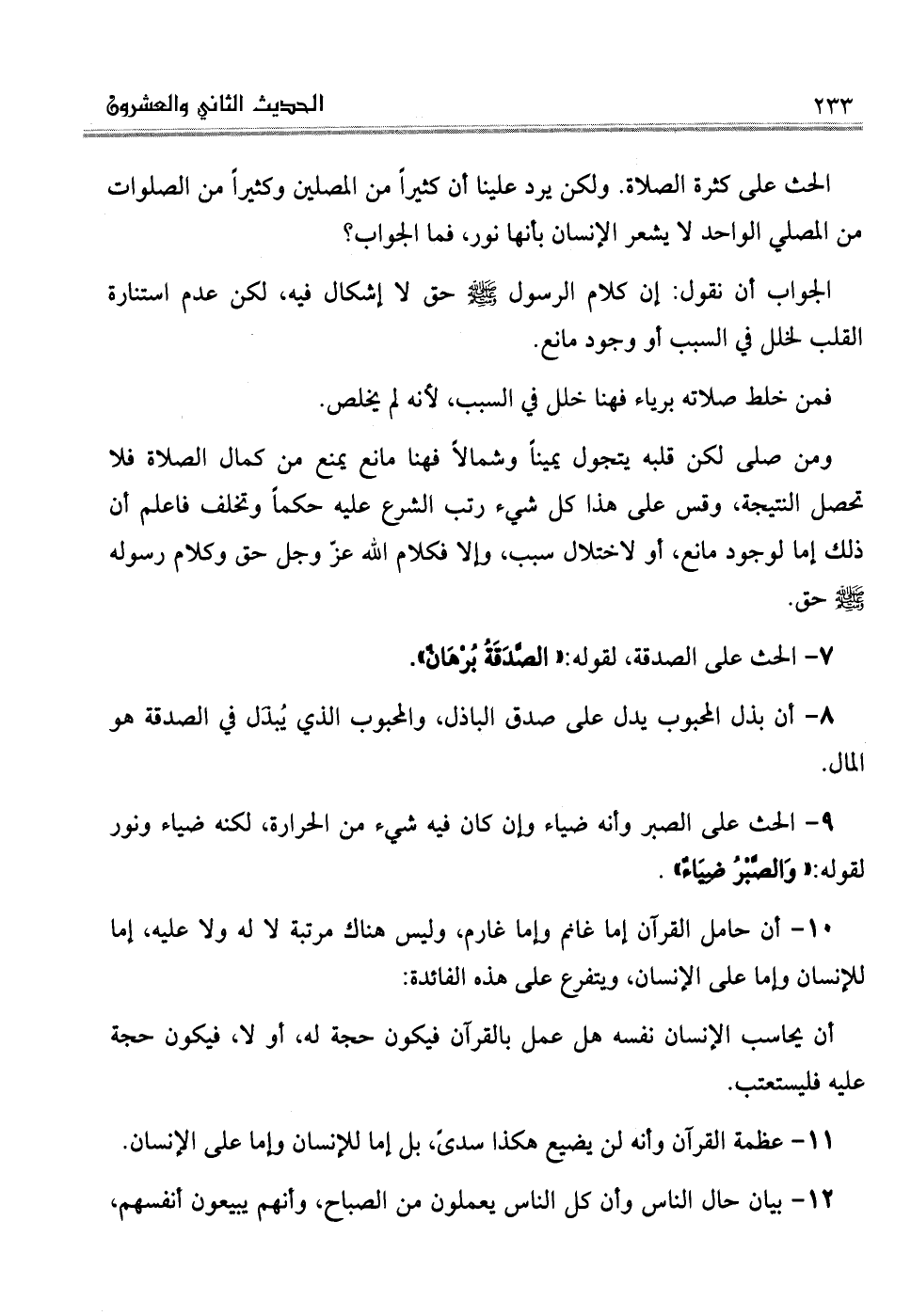 . 9الحث على الصبر وأنه ضياء وإن كان فيه شيء من الحرارة، لكنه ضياء ونور لقوله: "وَالصَّبْرُ ضِيَاءٌ".