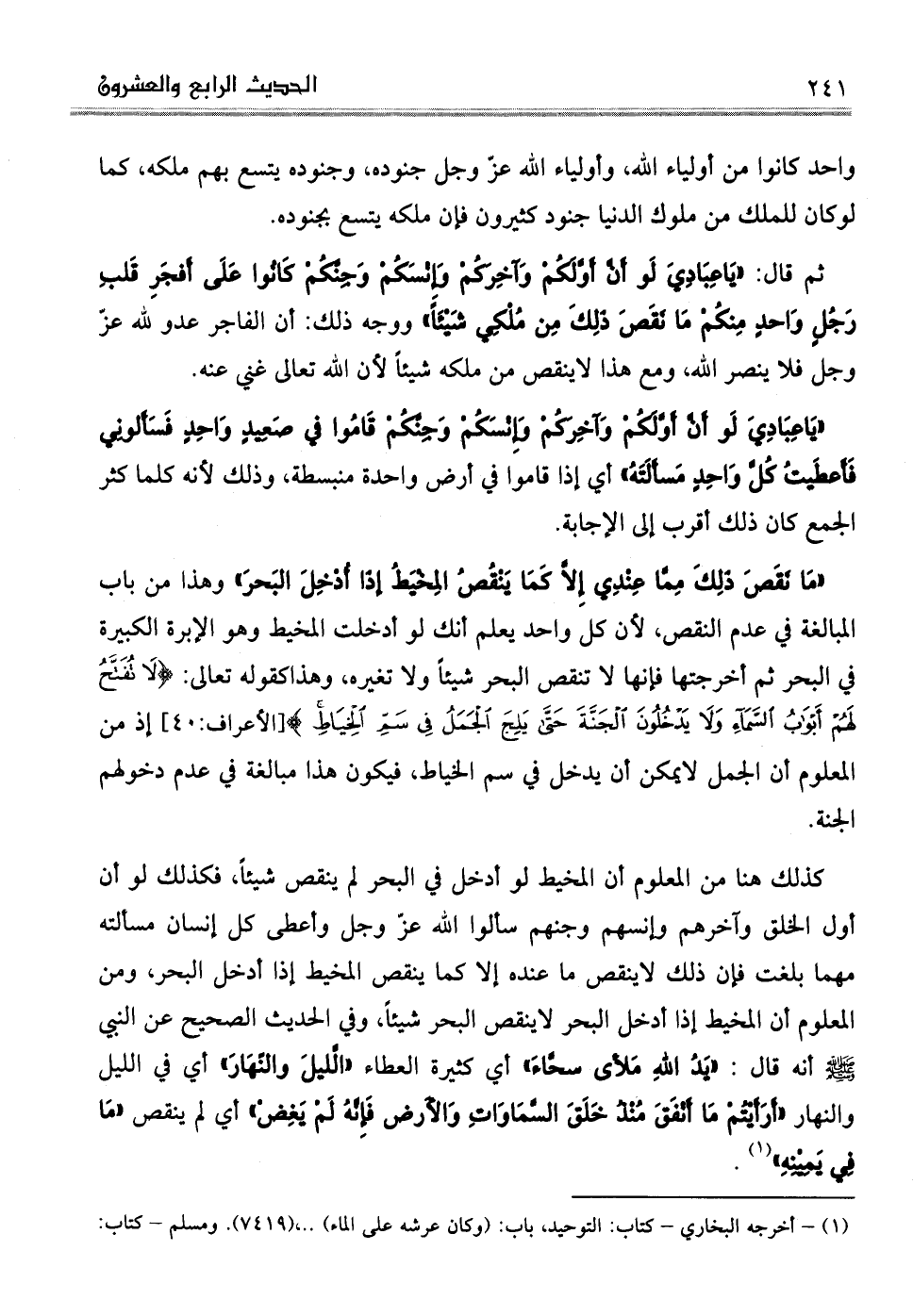 ثم قال: "يَاعِبَادِيَ لَو أَنَّ أَوَّلَكُمْ وَآخِرَكُمْ وَإِنْسَكُمْ وَجِنَّكُمْ كَانُوا عَلَى أَفجَرِ قَلبِ رَجُلٍ وَاحدٍ مِنكُمْ مَا نَقَصَ ذَلِكَ مِن مُلْكِي شَيْئَاً" ووجه ذلك: أن الفاجر عدو لله عزّ وجل فلا ينصر الله، ومع هذا لاينقص من ملكه شيئاً لأن الله تعالى غني عنه.