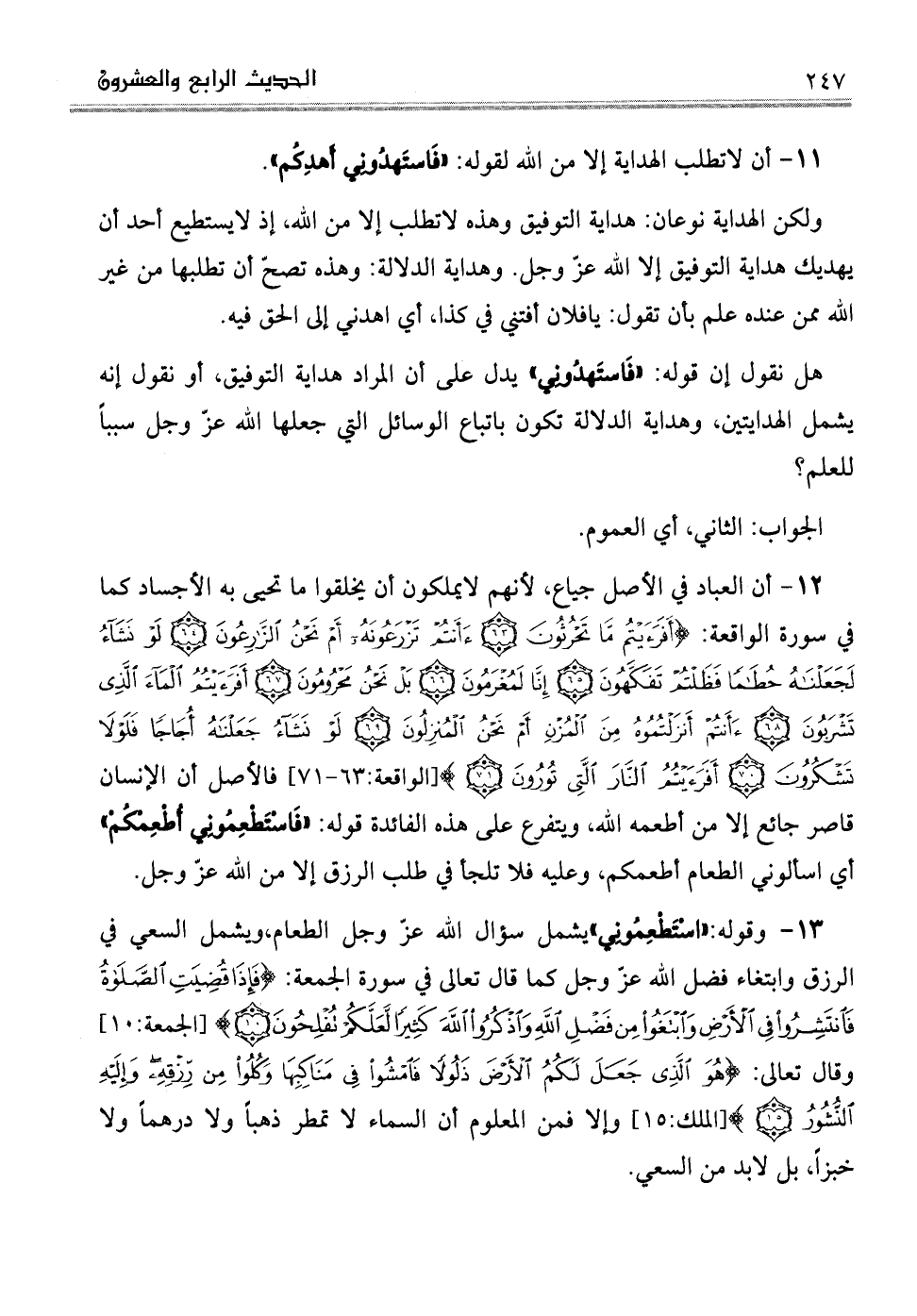 . 12أن العباد في الأصل جياع، لأنهم لايملكون أن يخلقوا ما تحيى به الأجساد كما في سورة الواقعة: (أَفَرَأَيْتُمْ مَا تَحْرُثُونَ*أَأَنْتُمْ تَزْرَعُونَهُ أَمْ نَحْنُ الزَّارِعُونَ* لَوْ نَشَاءُ لَجَعَلْنَاهُ حُطَاماً فَظَلْتُمْ تَفَكَّهُونَ* إِنَّا لَمُغْرَمُونَ*بَلْ نَحْنُ مَحْرُومُونَ*أَفَرَأَيْتُمُ الْمَاءَ الَّذِي تَشْرَبُون* أَأَنْتُمْ أَنْزَلْتُمُوهُ مِنَ الْمُزْنِ أَمْ نَحْنُ الْمُنْزِلُونَ لَوْ نَشَاءُ جَعَلْنَاهُ أُجَاجاً فَلَوْلا تَشْكُرُونَ* أَفَرَأَيْتُمُ النَّارَ الَّتِي تُورُونَ) (الواقعة: 63-71) فالأصل أن الإنسان قاصر جائع إلا من أطعمه الله، ويتفرع على هذه الفائدة قوله: "فَاسْتَطْعِمُونِي أُطْعِمْكُمْ" أي اسألوني الطعام أطعمكم، وعليه فلا تلجأ في طلب الرزق إلا من الله عزّ وجل.