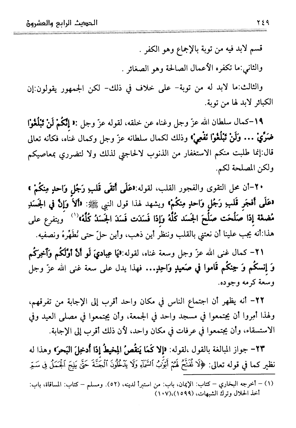 19-كمال سلطان الله عزّ وجل وغناه عن خلقه، لقوله عزّ وجل: إِنَّكُمْ لَنْ تَبْلُغُوْا ضَرِّيْ ... وَلَنْ تَبْلُغُوْا نَفْعِيْ وذلك لكمال سلطانه عزّ وجل وكمال غناه، فكأنه تعالى قال: إنما طلبت منكم الاستغفار من الذنوب لالحاجتي لذلك ولا لتضرري بمعاصيكم ولكن المصلحة لكم.