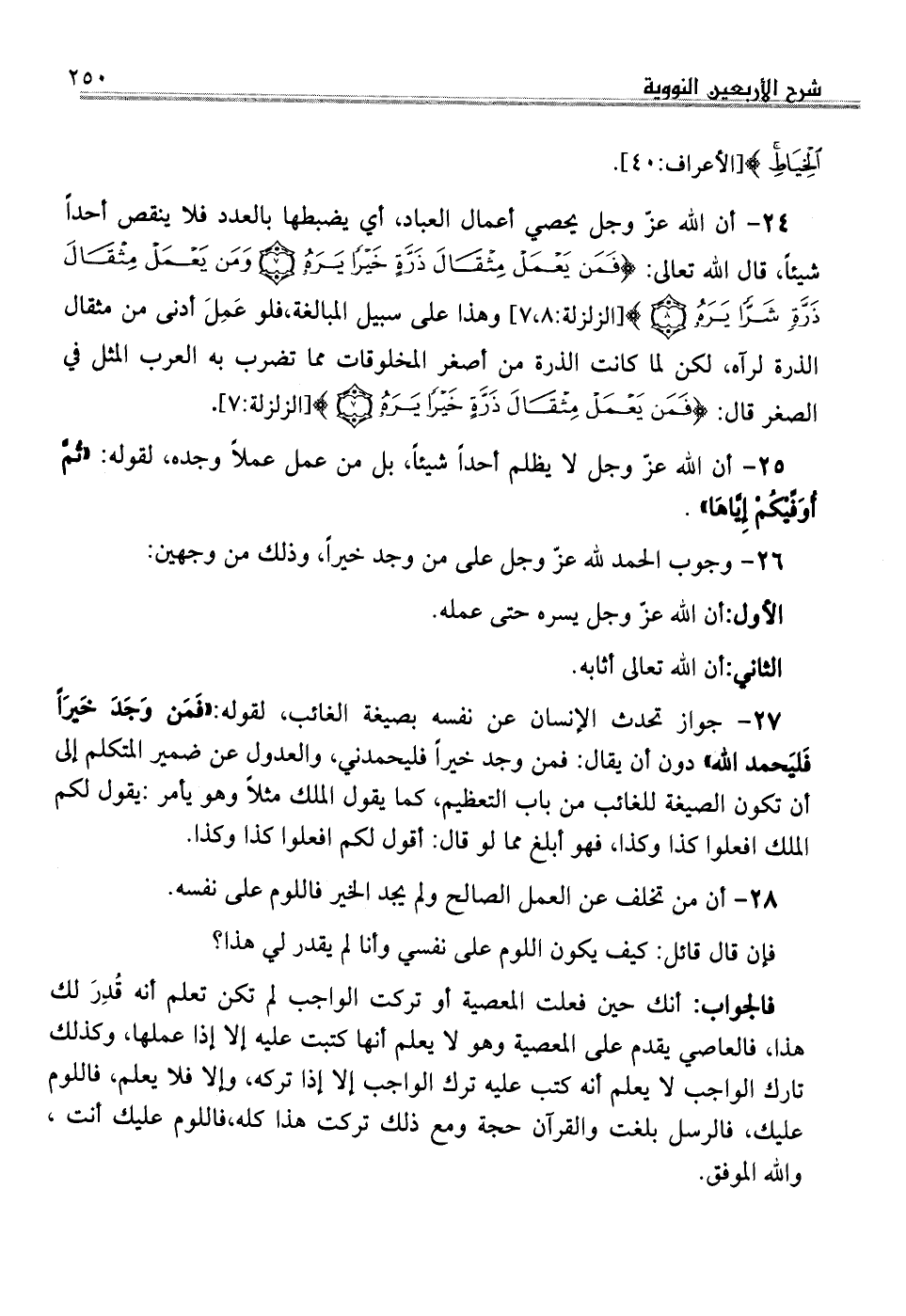 . 24أن الله عزّ وجل يحصي أعمال العباد، أي يضبطها بالعدد فلا ينقص أحداً شيئاً، قال الله تعالى: (فَمَنْ يَعْمَلْ مِثْقَالَ ذَرَّةٍ خَيْراً يَرَهُ*وَمَنْ يَعْمَلْ مِثْقَالَ ذَرَّةٍ شَرّاً يَرَهُ) (الزلزلة: 7، 8) وهذا على سبيل المبالغة، فلو عَمِلَ أدنى من مثقال الذرة لرآه، لكن لما كانت الذرة من أصغر المخلوقات مما تضرب به العرب المثل في الصغر قال: (فَمَنْ يَعْمَلْ مِثْقَالَ ذَرَّةٍ خَيْراً يَرَهُ) (الزلزلة: 7) .
