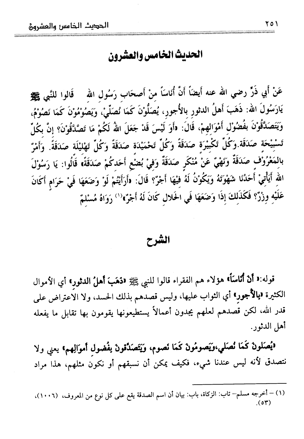 عَنْ أَبي ذَرٍّ رضي الله عنه أَيضَاً أَنَّ أُنَاسَاً مِنْ أَصحَابِ رَسُولِ اللهِ صلى الله عليه وسلم قَالوا للنَّبي صلى الله عليه وسلم يَارَسُولَ الله: ذَهَبَ أَهلُ الدثورِ بِالأُجورِ، يُصَلُّوْنَ كَمَا نُصَلِّيْ، وَيَصُوْمُوْنَ كَمَا نَصُوْمُ، وَيَتَصَدَّقُوْنَ بفُضُوْلِ أَمْوَالِهِمْ، قَالَ: (أَوَ لَيْسَ قَدْ جَعَلَ اللهُ لَكُمْ مَا تَصَّدَّقُوْنَ؟ إِنَّ بِكُلِّ تَسْبِيْحَةٍ صَدَقَة. وَكُلِّ تَكْبِيْرَةٍ صَدَقَةً وَكُلِّ تَحْمَيْدَةٍ صَدَقَةً وَكُلِّ تَهْلِيْلَةٍ صَدَقَةٌ وَأَمْرٌ بالِمَعْرُوْفٍ صَدَقَةٌ وَنَهْيٌ عَنْ مُنْكَرٍ صَدَقَةٌ وَفِيْ بُضْعِ أَحَدِكُمْ صَدَقَةٌ قَالُوا: يَا رَسُوْلَ اللهِ أَيَأْتِيْ أَحَدُنَا شَهْوَتَهُ وَيَكُوْنُ لَهُ فِيْهَا أَجْرٌ؟ قَالَ: أَرَأَيْتُمْ لَوْ وَضَعَهَا فَيْ حَرَامٍ أَكَانَ عَلَيْهِ وِزْرٌ؟ فَكَذَلِكَ إِذَا وَضَعَهَا فَي الحَلالِ كَانَ لَهُ أَجْرٌ) (¬1) رَوَاهُ مُسْلِمٌ
