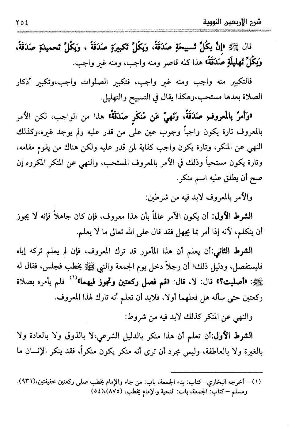 "وَأَمرٌ بِالمَعروفِ صَدَقَةٌ، وَنَهيٌ عَن مُنكَرٍ صَدَقَةٌ" هذا من الواجب، لكن الأمر بالمعروف تارة يكون واجباً وجوب عين على من قدر عليه ولم يوجد غيره، وكذلك النهي عن المنكر، وتارة يكون واجب كفاية لمن قدر عليه ولكن هناك من يقوم مقامه، وتارة يكون مستحباً وذلك في الأمر بالمعروف المستحب، والنهي عن المنكر المكروه إن صح أن يطلق عليه اسم منكر.