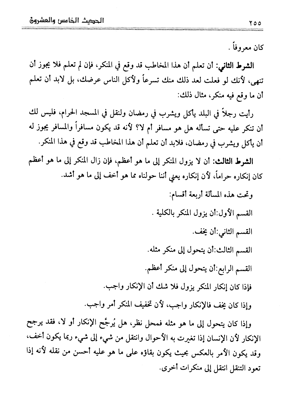 الشرط الثالث: أن لا يزول المنكر إلى ما هو أعظم، فإن زال المنكر إلى ما هو أعظم كان إنكاره حراماً، لأن إنكاره يعني أننا حولناه مما هو أخف إلى ما هو أشد.