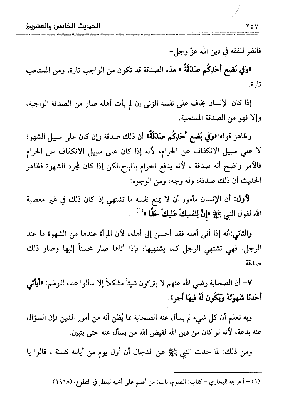 وظاهر قوله: "وَفي بُضع أَحَدِكُم صَدَقَةٌ" أن ذلك صدقة وإن كان على سبيل الشهوة لا علي سبيل الانكفاف عن الحرام، لأنه إذا كان على سبيل الانكفاف عن الحرام فالأمر واضح أنه صدقة، لأنه يدفع الحرام بالمباح، لكن إذا كان لمجرد الشهوة فظاهر الحديث أن ذلك صدقة، وله وجه، ومن الوجوه: