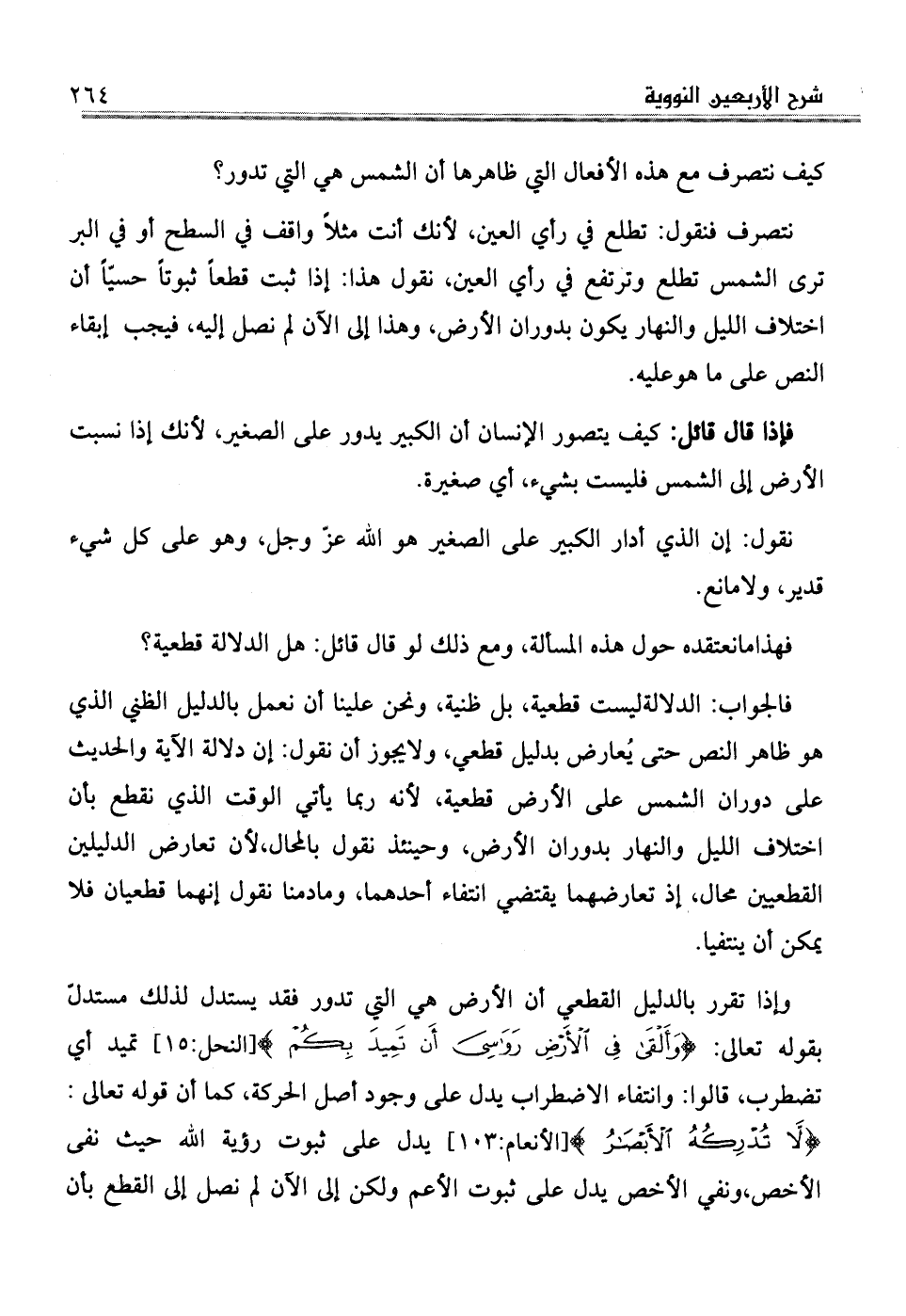 نتصرف فنقول: تطلع في رأي العين، لأنك أنت مثلاً واقف في السطح أو في البر ترى الشمس تطلع وترتفع في رأي العين، نقول هذا: إذا ثبت قطعاً ثبوتاً حسيّاً أن اختلاف الليل والنهار يكون بدوران الأرض، وهذا إلى الآن لم نصل إليه، فيجب إبقاء النص على ما هوعليه.