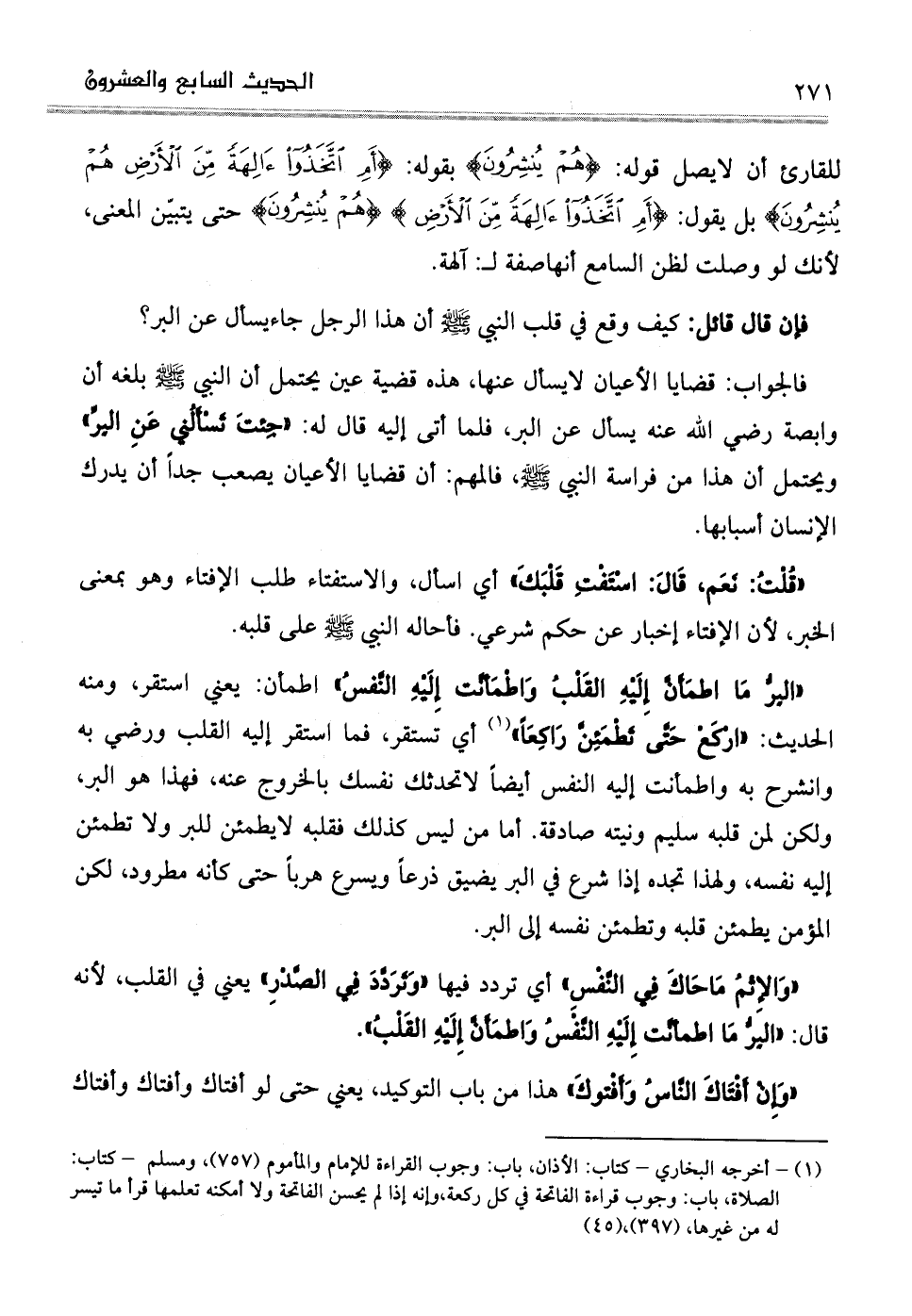 (البر ما اطمأن إليه القلب واطمأنت إليه النفس) اطمأن يعني: استقر ومنه الحديث: (اركع حتى تطمئن راكعا) (¬1) أي تستقر فما استقر إليه القلب ورضي به وانشرح به واطمأنت إليه النفس أيضا لا تحدثك نفسك بالخروج عنه فهذا هو البر ولكن لمن قلبه سليم ونيته صادقه. أما من ليس كذلك فقلبه لا يطمئن للبر ولا تطمئن إليه نفسه ولهذا تجده إذا شرع في البر يضيق ذرعا ويسرع هربا حتى كأنه مطرود، لكن المؤمن يطمئن قلبه وتطمئن نفسه إلى البر.