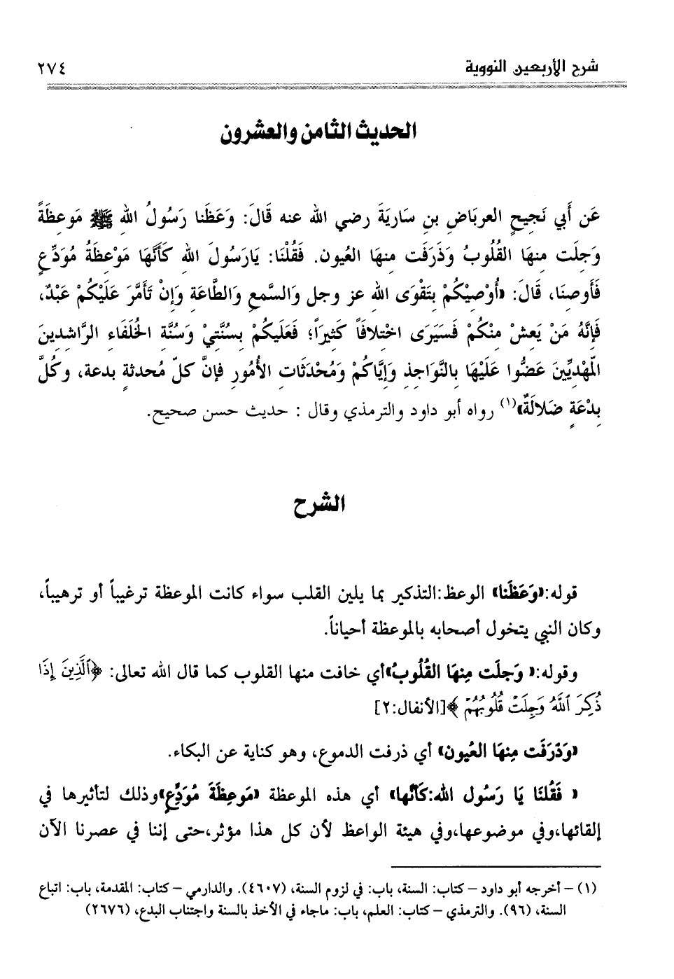 عَن أَبي نَجِيحٍ العربَاضِ بنِ سَاريَةَ رضي الله عنه قَالَ: وَعَظَنا رَسُولُ اللهِ مَوعِظَةً وَجِلَت مِنهَا القُلُوبُ وَذَرَفَت مِنهَا العُيون. فَقُلْنَا: يَارَسُولَ اللهِ كَأَنَّهَا مَوْعِظَةُ مُوَدِّعٍ فَأَوصِنَا، قَالَ: (أُوْصِيْكُمْ بِتَقْوَى اللهِ عز وجل وَالسَّمعِ وَالطَّاعَةِ وَإِنْ تَأَمَّرَ عَلَيْكُمْ عَبْدٌ، فَإِنَّهُ مَنْ يَعِشْ مِنْكُمْ فَسَيَرَى اخْتِلافَاً كَثِيرَاً؛ فَعَلَيكُمْ بِسُنَّتِيْ وَسُنَّةِ الخُلَفَاءِ الرَّاشِدِينَ المّهْدِيِّينَ عَضُّوا عَلَيْهَا بِالنَّوَاجِذِ وَإِيَّاكُمْ وَمُحْدَثَاتِ الأُمُورِ فإنَّ كلّ مُحدثةٍ بدعة، وكُلَّ بِدْعَةٍ ضَلالَةٌ) (¬1) رواه أبو داود والترمذي وقال: حديث حسن صحيح.