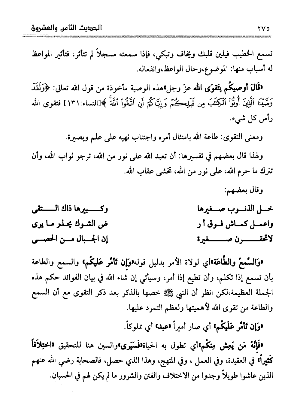 " قَالَ أوصيكُم بِتَقوَى الله عزّ وجل" هذه الوصية مأخوذة من قول الله تعالى: (وَلَقَدْ وَصَّيْنَا الَّذِينَ أُوتُوا الْكِتَابَ مِنْ قَبْلِكُمْ وَإِيَّاكُمْ أَنِ اتَّقُوا اللَّهَ) (النساء: الآية131) فتقوى الله رأس كل شيء.