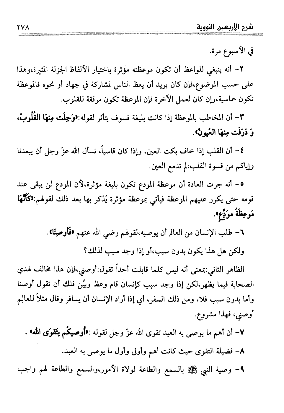 . 2أنه ينبغي للواعظ أن تكون موعظته مؤثرة باختيار الألفاظ الجزلة المثيرة، وهذا على حسب الموضوع، فإن كان يريد أن يعظ الناس لمشاركة في جهاد أو نحوه فالموعظة تكون حماسية، وإن كان لعمل الآخرة فإن الموعظة تكون مرققة للقلوب.