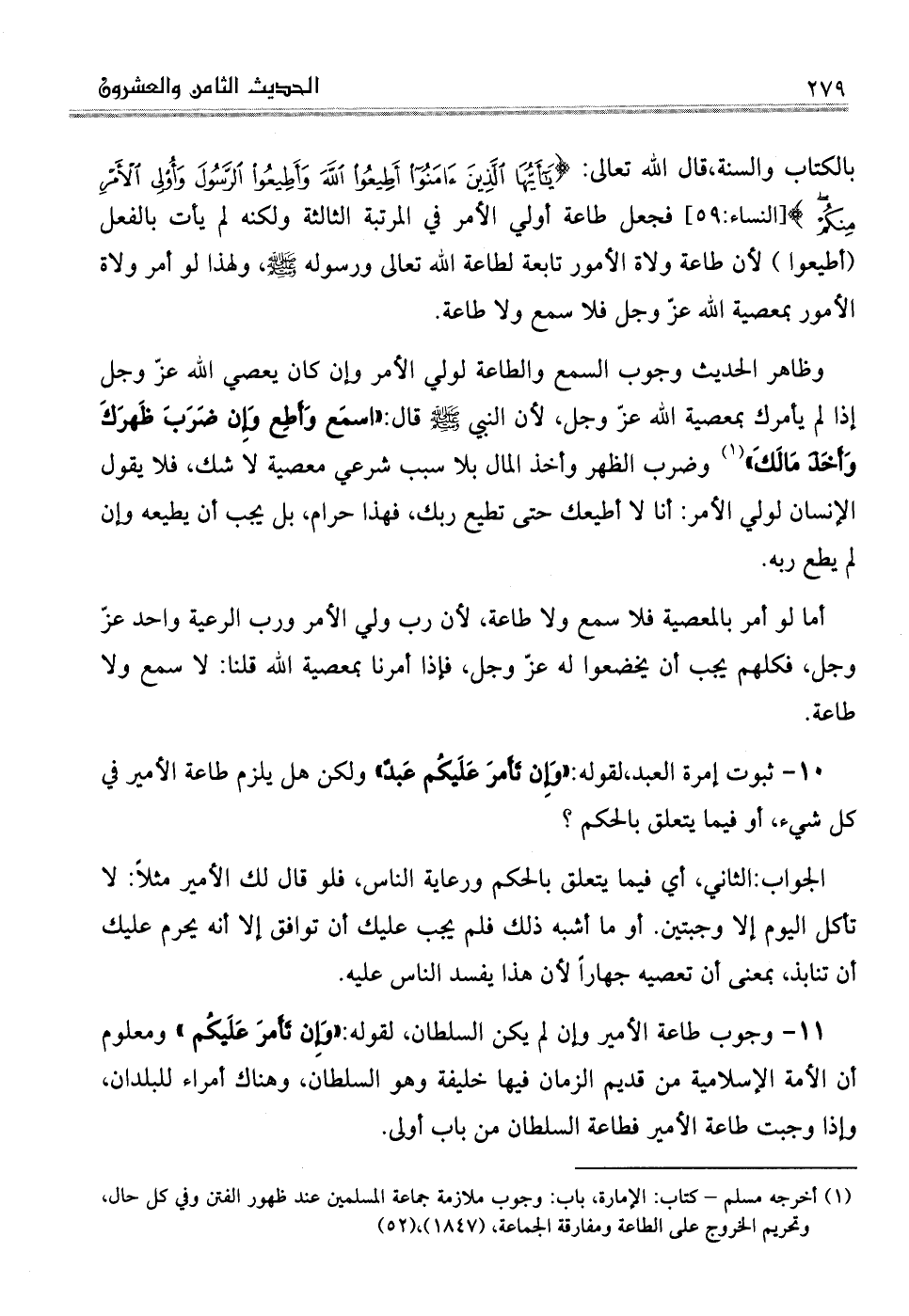 . 10ثبوت إمرة العبد، لقوله: "وَإِن تَأَمرَ عَلَيكُم عَبدٌ" ولكن هل يلزم طاعة الأمير في كل شيء، أو فيما يتعلق بالحكم؟
