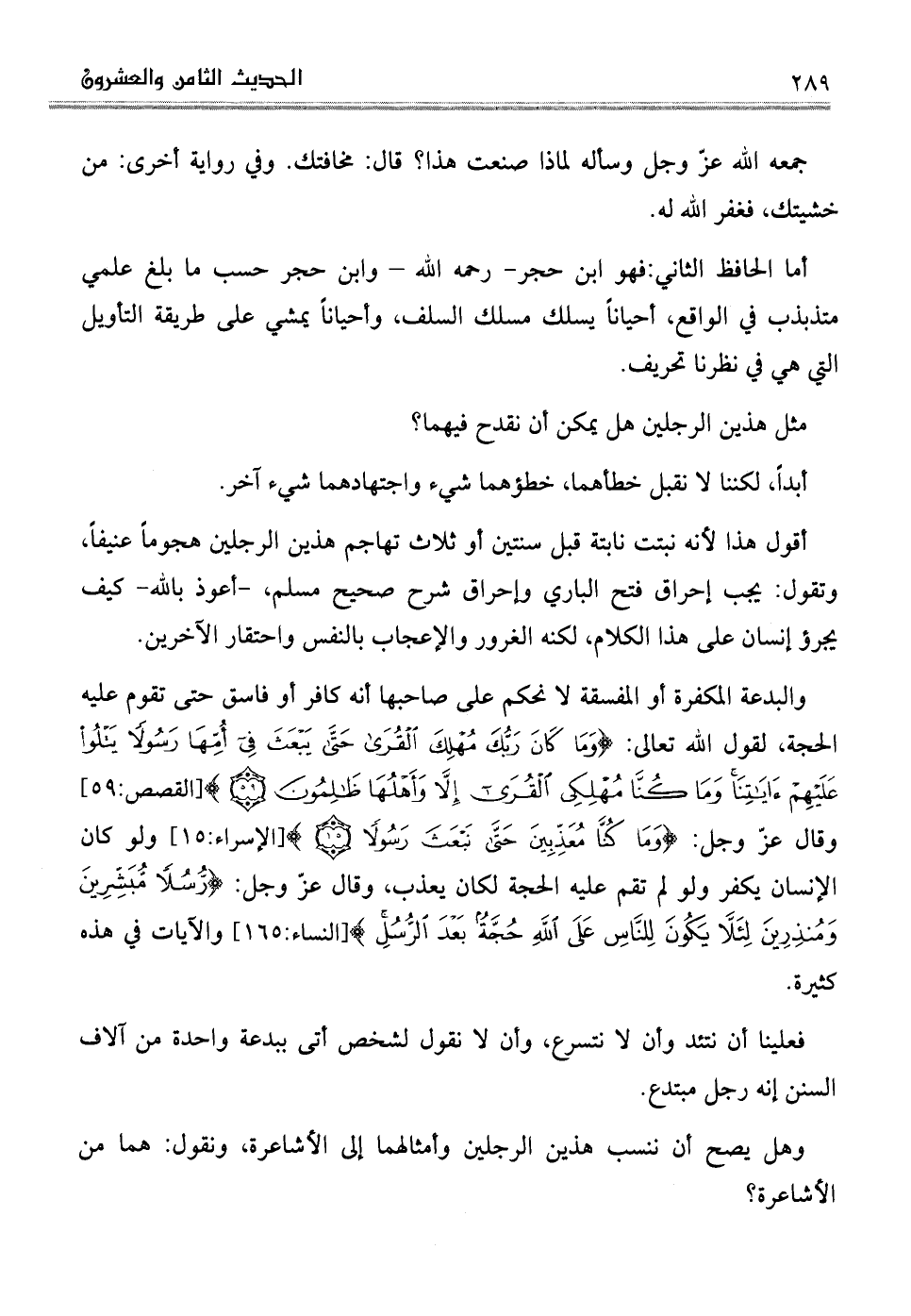 والبدعة المكفرة أو المفسقة لا نحكم على صاحبها أنه كافر أو فاسق حتى تقوم عليه الحجة، لقول الله تعالى: (وَمَا كَانَ رَبُّكَ مُهْلِكَ الْقُرَى حَتَّى يَبْعَثَ فِي أُمِّهَا رَسُولاً يَتْلُو عَلَيْهِمْ آيَاتِنَا وَمَا كُنَّا مُهْلِكِي الْقُرَى إِلَّا وَأَهْلُهَا ظَالِمُونَ) (القصص: 59)