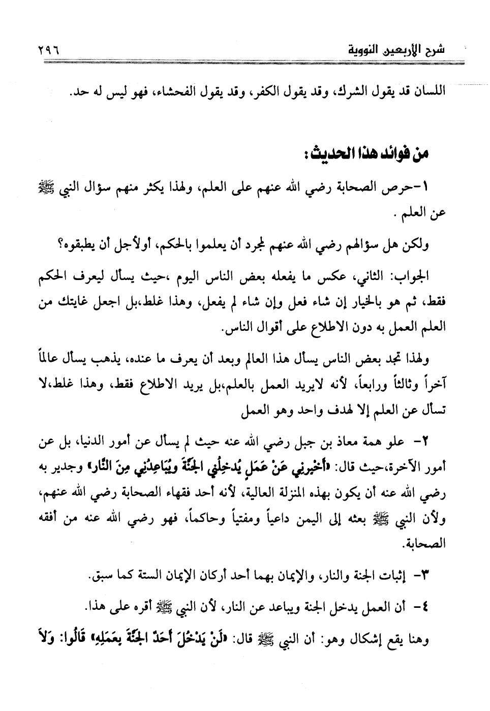 . 4 أن العمل يدخل الجنة ويباعد عن النار، لأن النبي صلى الله عليه وسلم أقره على هذا.