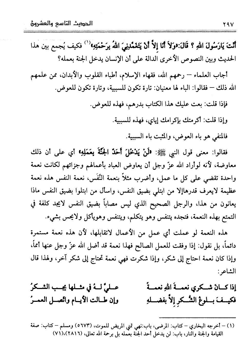 فقالوا: معنى قول النبي صلى الله عليه وسلم: "لَنْ يَدْخُلَ أَحَدٌ الجَنَّةَ بِعَمَلِهِ" أي على أن ذلك معاوضة، لأنه لوأراد الله عزّ وجل أن يعاوض العباد بأعمالهم وجزائهم لكانت نعمة واحدة تقضي على كل ما عمل، وأضرب مثلاً بنعمة النَّفَس، نعمة النفس هذه نعمة عظيمة لايعرف قدرهاإلا من ابتلي بضيق النفس، واسأل من ابتلوا بضيق النفس ماذا يعانون من هذا، والرجل الصحيح الذي ليس مصاباً بضيق النفس لايجد كلفة في التمتع بهذه النعمة، فتجده يتنفس وهو يتكلم، ويتنفس وهويأكل ولايحس بشيء.