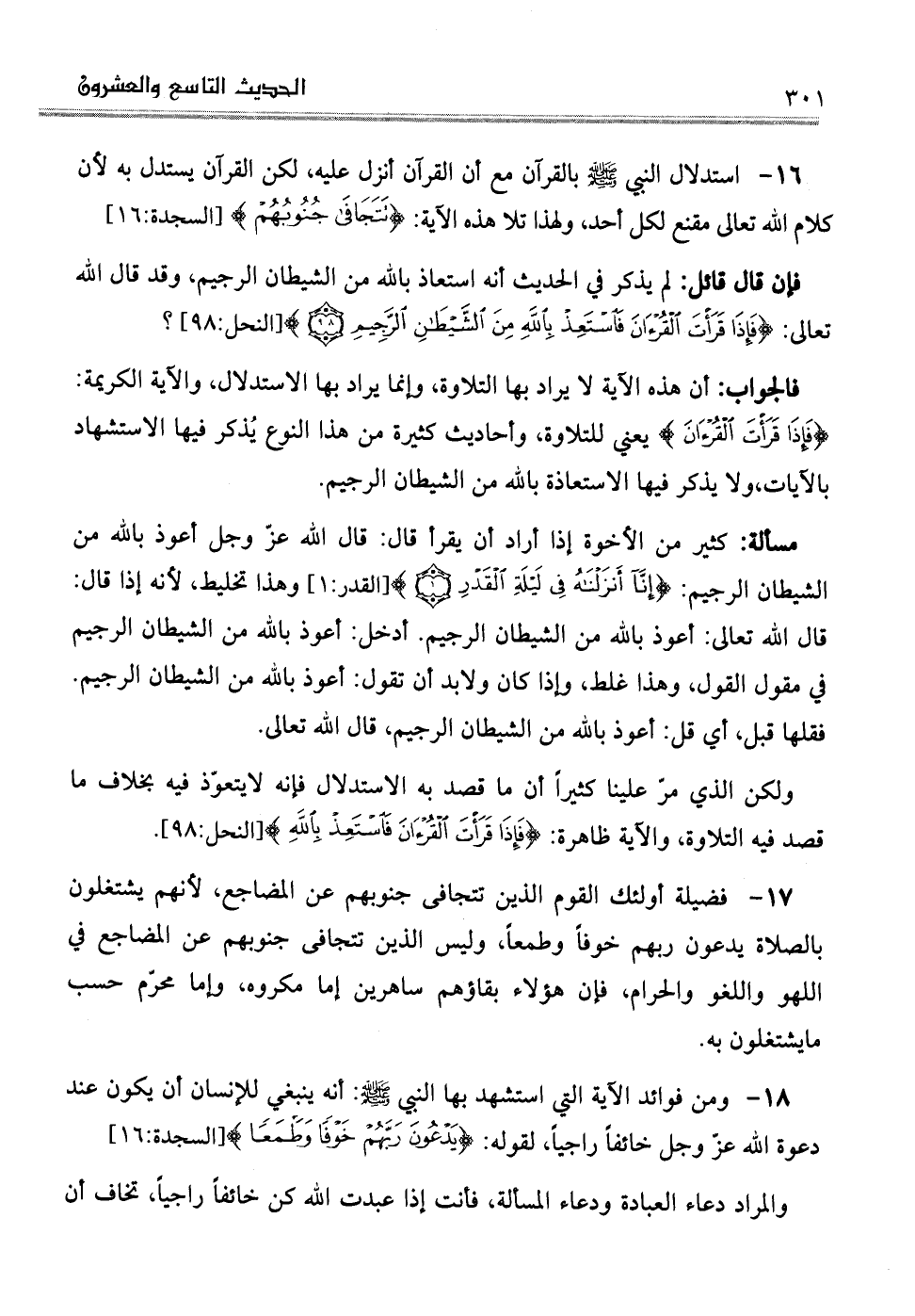 16-استدلال النبي صلى الله عليه وسلم بالقرآن مع أن القرآن أنزل عليه، لكن القرآن يستدل به لأن كلام الله تعالى مقنع لكل أحد، ولهذا تلا هذه الآية: (تَتَجَافَى جُنُوبُهُمْ) (السجدة: الآية16)