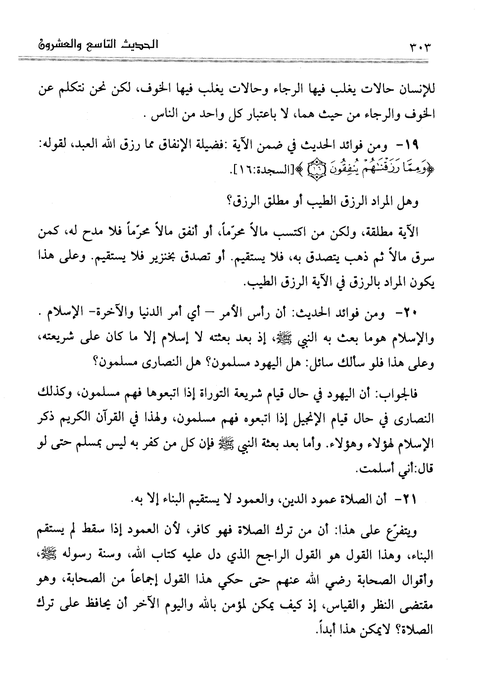 20- ومن فوائد الحديث: أن رأس الأمر - أي أمر الدنيا والآخرة- الإسلام. والإسلام هوما بعث به النبي صلى الله عليه وسلم، إذ بعد بعثته لا إسلام إلا ما كان على شريعته، وعلى هذا فلو سألك سائل: هل اليهود مسلمون؟ هل النصارى مسلمون؟