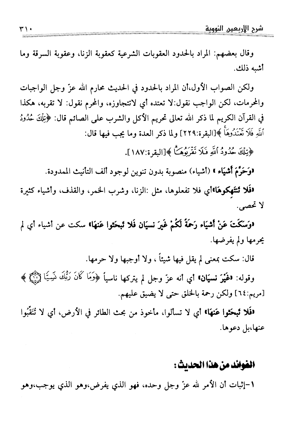 ولكن الصواب الأول، أن المراد بالحدود في الحديث محارم الله عزّ وجل الواجبات والمحرمات، لكن الواجب نقول: لا تعتده أي لاتتجاوزه، والمحرم نقول: لا تقربه، هكذا في القرآن الكريم لما ذكر الله تعالى تحريم الأكل والشرب على الصائم قال: (تِلْكَ حُدُودُ اللَّهِ فَلا تَعْتَدُوهَا) (البقرة: الآية229) ولما ذكر العدة وما يجب فيها قال: (تِلْكَ حُدُودُ اللَّهِ فَلا تَقرَبُوهَا) (البقرة: 187) .