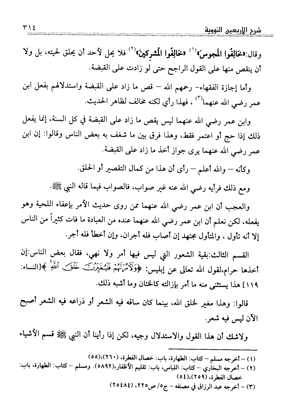 وقال: خَالِفُوا المَجوسَ (¬1) خَالِفُوا المُشرِكينَ (¬2) فلا يحل لأحد أن يحلق لحيته، بل ولا أن ينقص منها على القول الراجح حتى لو زادت على القبضة.