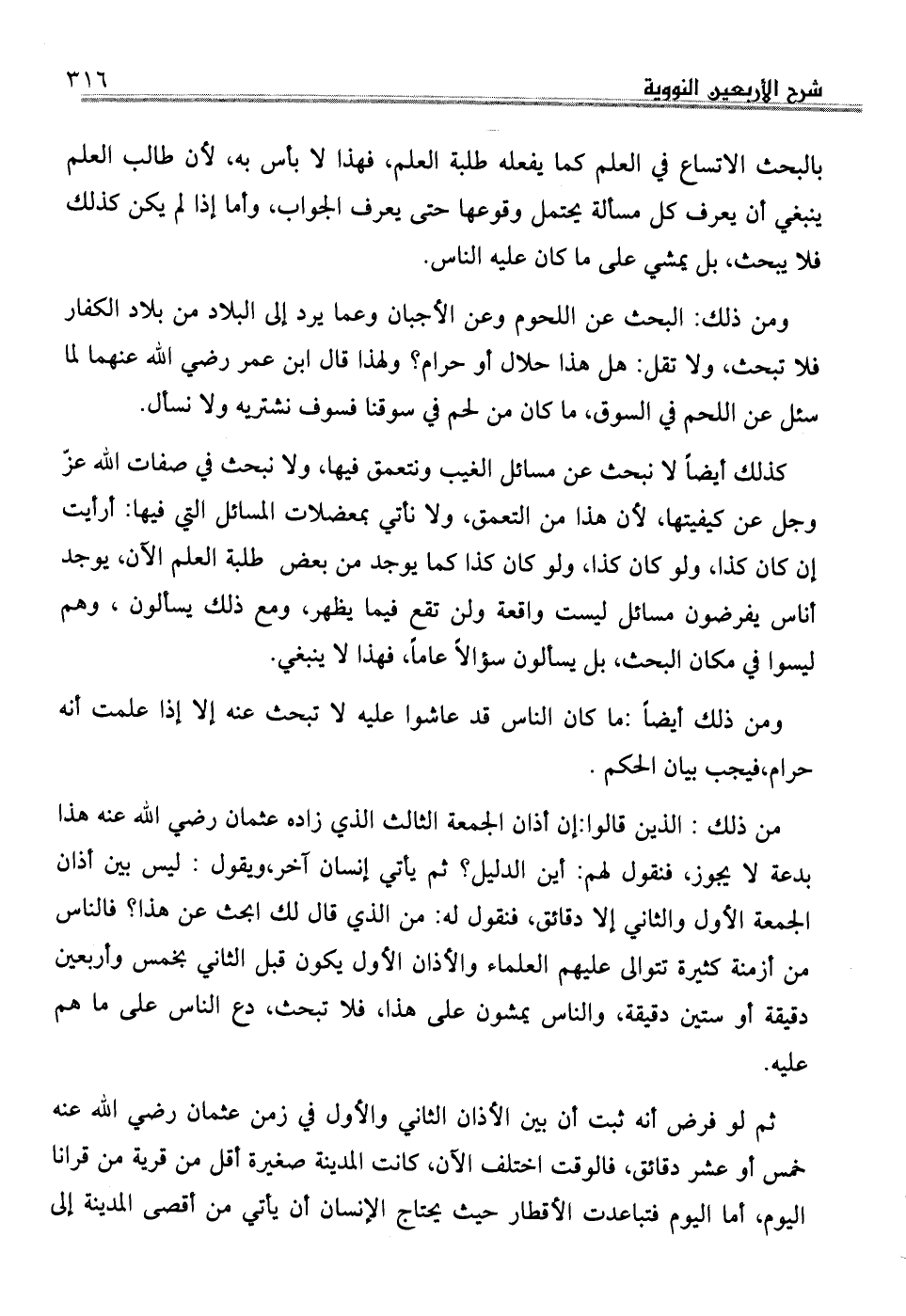 كذلك أيضاً لا نبحث عن مسائل الغيب ونتعمق فيها، ولا نبحث في صفات الله عزّ وجل عن كيفيتها، لأن هذا من التعمق، ولا نأتي بمعضلات المسائل التي فيها: أرأيت إن كان كذا، ولو كان كذا، ولو كان كذا كما يوجد من بعض طلبة العلم الآن، يوجد أناس يفرضون مسائل ليست واقعة ولن تقع فيما يظهر، ومع ذلك يسألون، وهم ليسوا في مكان البحث، بل يسألون سؤالاً عاماً، فهذا لا ينبغي.