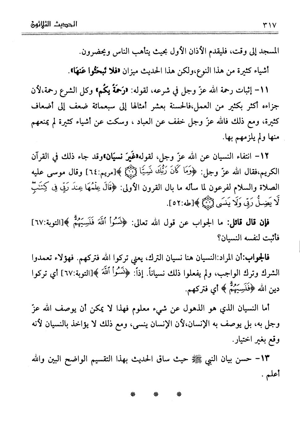 12انتفاء النسيان عن الله عزّ وجل، لقوله "غَيرَ نسيَان" وقد جاء ذلك في القرآن الكريم، فقال الله عزّ وجل: (وَمَا كَانَ رَبُّكَ نَسِيّاً) (مريم: 64) وقال موسى عليه الصلاة والسلام لفرعون لما سأله ما بال القرون الأولى: (قَالَ عِلْمُهَا عِنْدَ رَبِّي فِي كِتَابٍ لا يَضِلُّ رَبِّي وَلا يَنْسَى) (طه: 52)