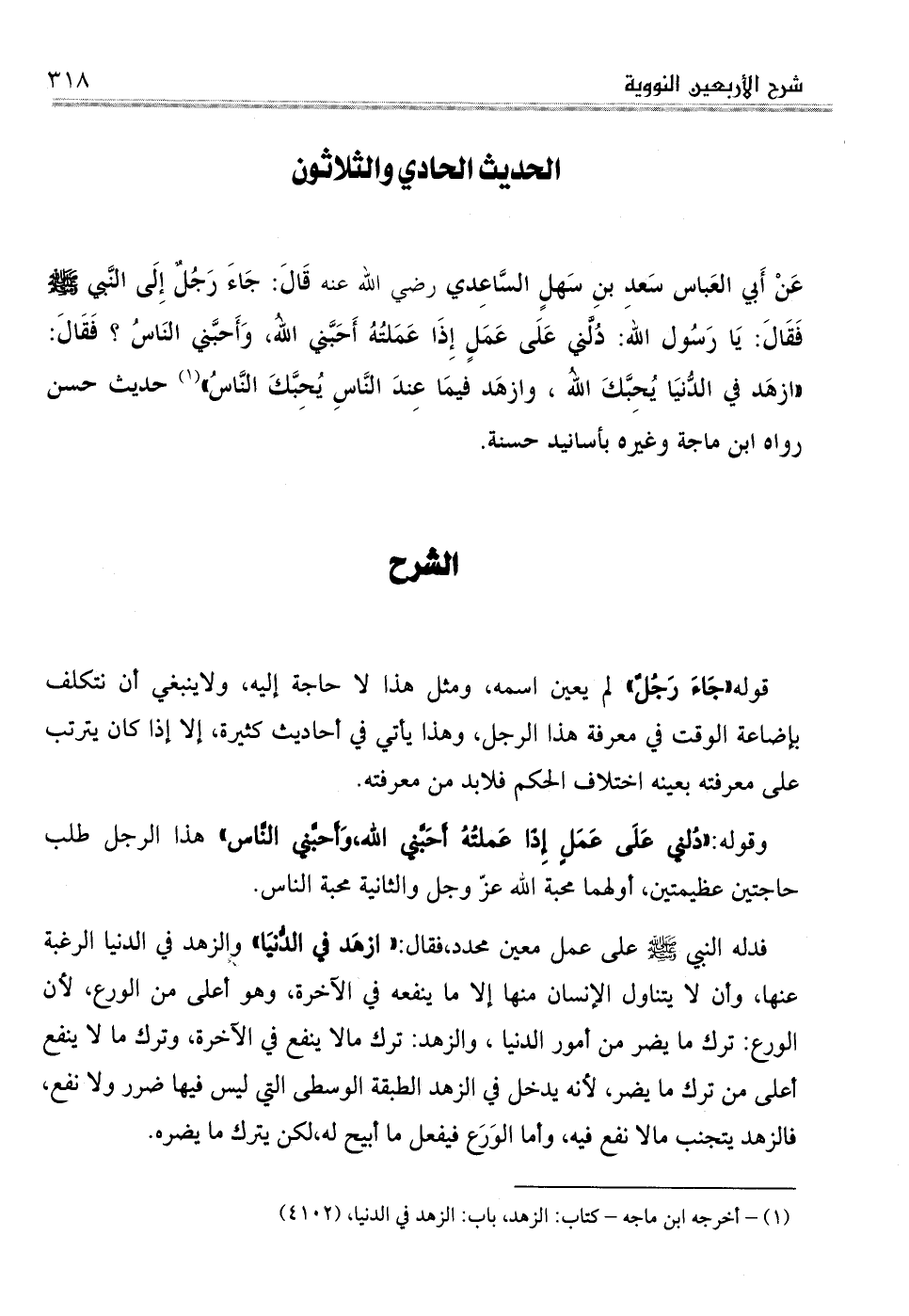 عَنْ أَبي العَباس سَعدِ بنِ سَهلٍ السَّاعِدي رضي الله عنه قَالَ: جَاءَ رَجُلٌ إِلَى النبي صلى الله عليه وسلم فَقَالَ: يَا رَسُول الله: دُلَّني عَلَى عَمَلٍ إِذَا عَمَلتُهُ أَحَبَّني اللهُ، وَأَحبَّني النَاسُ؟ فَقَالَ: (ازهَد في الدُّنيَا يُحِبَّكَ اللهُ، وازهَد فيمَا عِندَ النَّاسِ يُحِبَّكَ النَّاسُ) (¬1) حديث حسن رواه ابن ماجة وغيره بأسانيد حسنة.