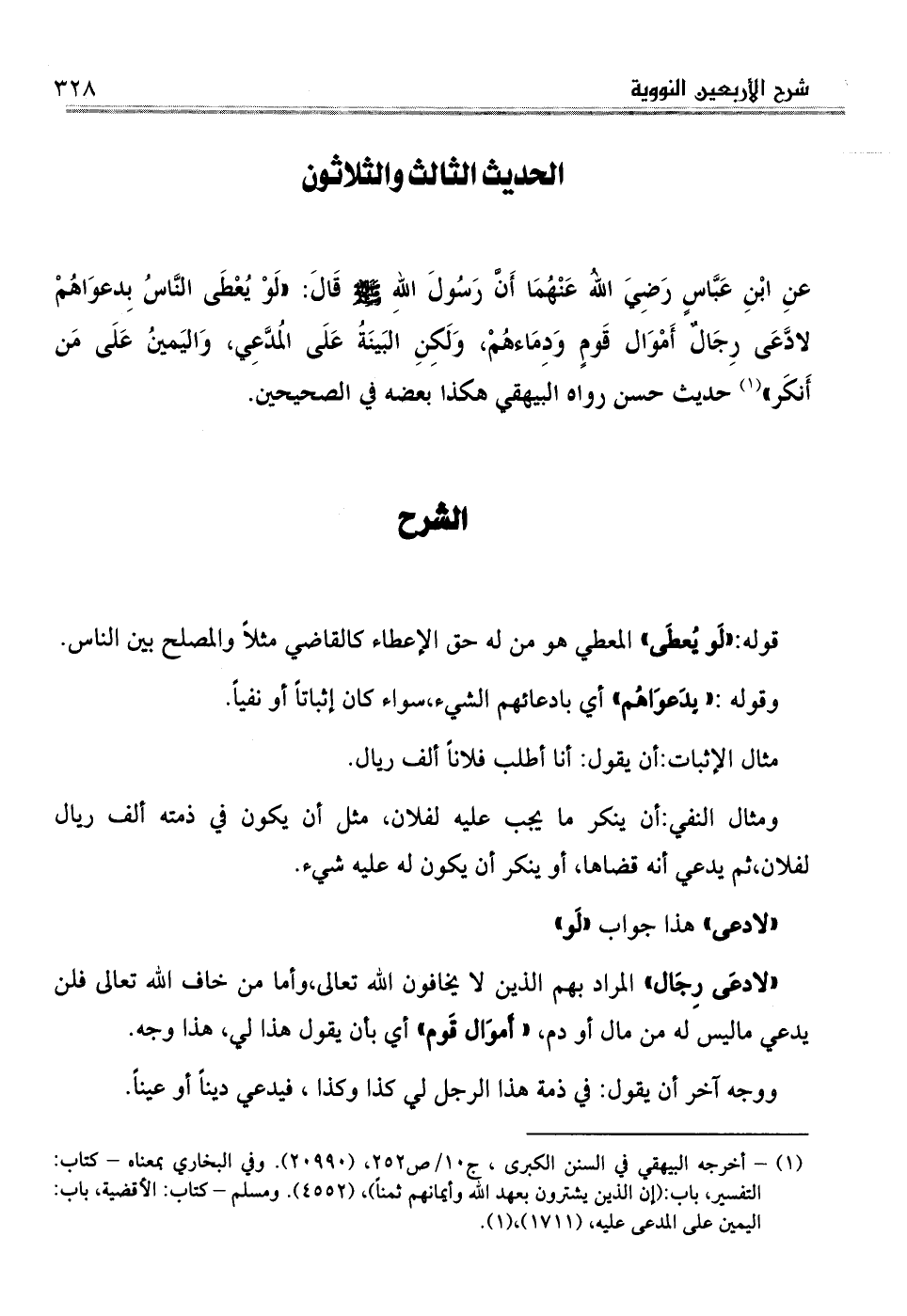 عنِ ابْنِ عَبَّاسٍ رَضِيَ اللهُ عَنْهُمَا أَنَّ رَسُولَ اللهِ صلى الله عليه وسلم قَالَ: "لَوْ يُعْطَى النَّاسُ بِدعوَاهُمْ لادَّعَى رِجَالٌ أَمْوَال قَومٍ وَدِمَاءهُمْ، وَلَكِنِ البَينَةُ عَلَى المُدَّعِي، وَاليَمينُ عَلَى مَن أَنكَر" (¬1) حديث حسن رواه البيهقي هكذا بعضه في الصحيحين.