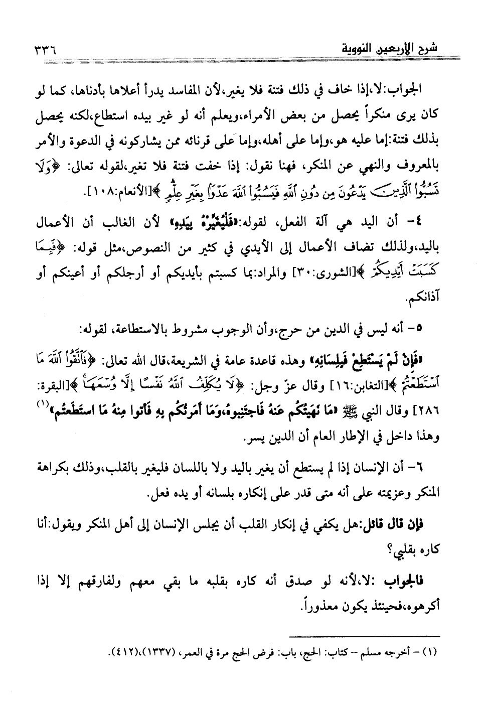. 5أنه ليس في الدين من حرج، وأن الوجوب مشروط بالاستطاعة، لقوله: (فَإِنْ لَمْ يَسْتَطِعْ فَبِلِسَانِهِ وهذه قاعدة عامة في الشريعة، قال الله تعالى: (فَاتَّقُوا اللَّهَ مَا اسْتَطَعْتُمْ) (التغابن: الآية16) وقال عزّ وجل: (لا يُكَلِّفُ اللَّهُ نَفْساً إِلاَّ وُسْعَهَا) (البقرة: الآية286) وقال النبي صلى الله عليه وسلم "مَا نَهَيتُكُم عَنهُ فَاجتَنِبوهُ، وَمَا أَمَرتُكُم بِهِ فَأتوا مِنهُ مَا استَطَعتُم" (¬1) وهذا داخل في الإطار العام أن الدين يسر.