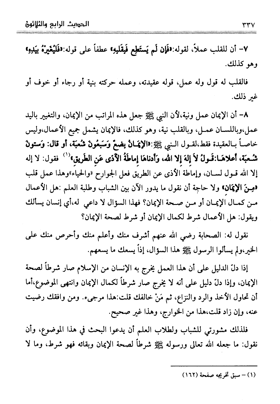 . 8أن الإيمان عمل ونية، لأن النبي صلى الله عليه وسلم جعل هذه المراتب من الإيمان، والتغيير باليد عمل، وباللسان عمل، وبالقلب نية، وهو كذلك، فالإيمان يشمل جميع الأعمال، وليس خاصاً بالعقيدة فقط، لقول النبي صلى الله عليه وسلم: "الإيمَانُ بِضعٌ وَسَبعُونَ شُعبَة، أو قال: وَستونَ شُعبَة، أَعلاهَا: قَولُ لاَ إِلهَ إِلا الله، وَأَدناهَا إِماطَةُ الأَذَى عَنِ الطَريقِ" (¬1) فقول: لا إله إلا الله قول لسان، وإماطة الأذى عن الطريق فعل الجوارح والحياء وهذا عمل قلب مِنَ الإيمَانِ ولا حاجة أن نقول ما يدور الآن بين الشباب وطلبة العلم: هل الأعمال من كمال الإيمان أو من صحة الإيمان؟ فهذا السؤال لا داعي له، أي إنسان يسألك ويقول: هل الأعمال شرط لكمال الإيمان أو شرط لصحة الإيمان؟