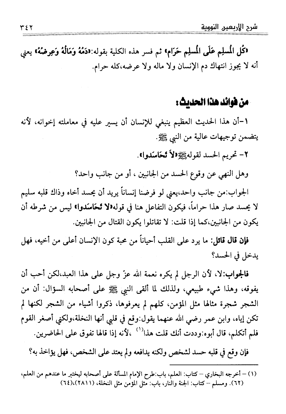 فالجواب: لا، لأن الرجل لم يكره نعمة الله عزّ وجل على هذا العبد، لكن أحب أن يفوقه، وهذا شيء طبيعي، ولذلك لما ألقى النبي صلى الله عليه وسلم على أصحابه السؤال: أن من الشجر شجرة مثلها مثل المؤمن، كلهم لم يعرفوها، ذكروا أشياء من الشجر لكنها لم تكن إياه، وابن عمر رضي الله عنهما يقول: وقع في قلبي أنها النخلة، ولكني أصغر القوم فلم أتكلم، قال أبوه: وددت أنك قلت هذا (¬1) ، لأنه إذا قالها تفوق على الحاضرين.